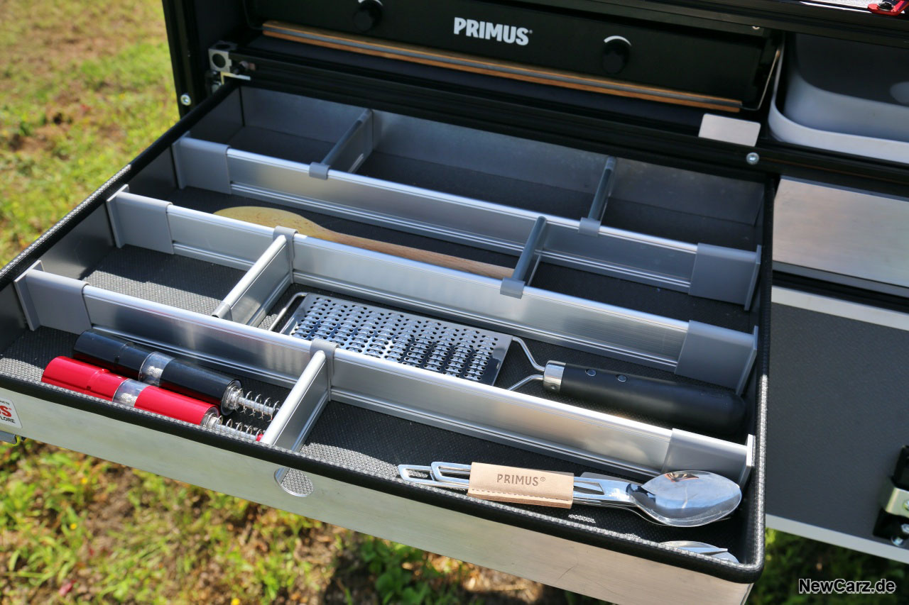 Zu dieser gehört ein zweiflammiger Gaskocher, eine klappbare Spüle inklusive einem insgesamt 24 Liter fassenden Wasserreservoir mit E-Pumpentechnik. Ein reichhaltiges PRIMUS-Konglomerat, bestehend aus Töpfen, Pfannen, Tassen, Besteck, ja sogar Gewürzstreuer und weiteren Utensilien die man in einer Küche vermuten würde, gehören ebenso dazu. Sogar eine kleine Außendusche ist vorhanden.