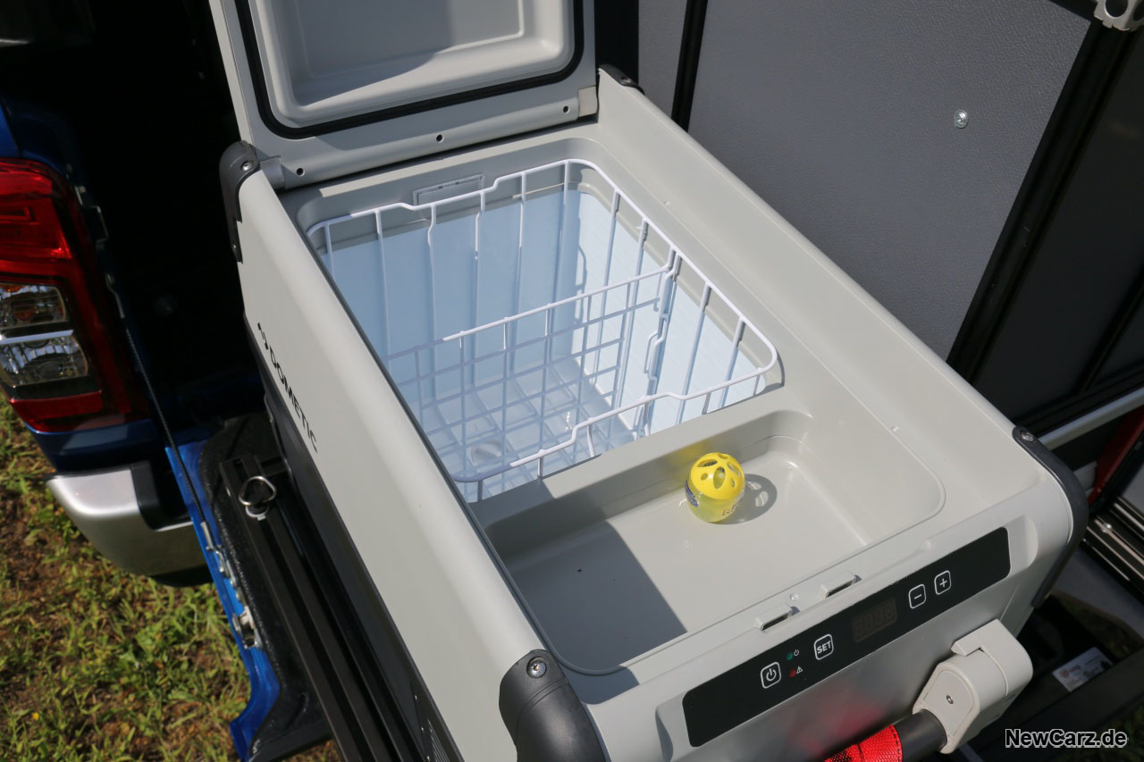 Weiterhin gehören eine 35 Liter fassende Kühlbox, ein ausziehbares Schubladenregal mit diversen Fächern und mehrere Stauraumschränke links und rechts im Hardtop dazu, welche zum Teil mit weiterem Equipment befüllt sind.
