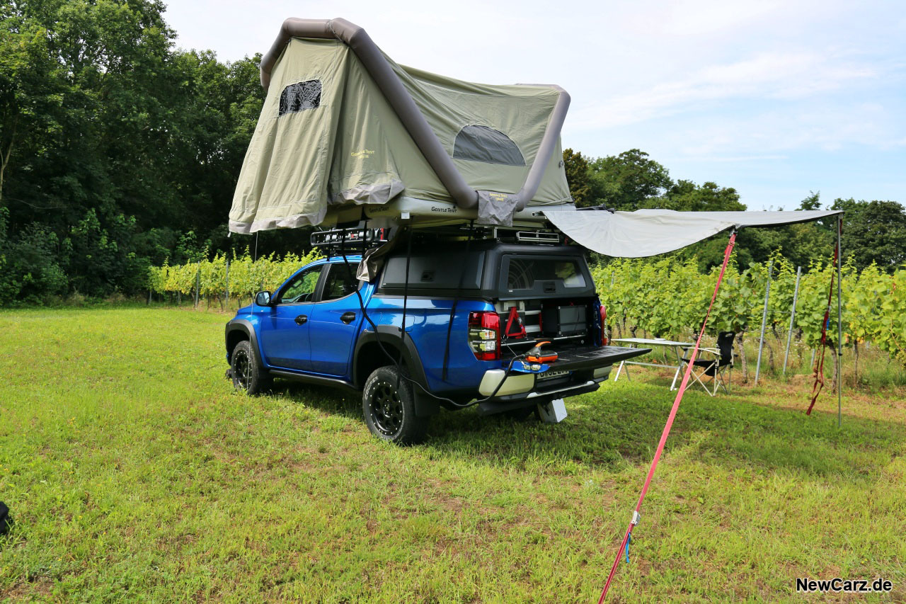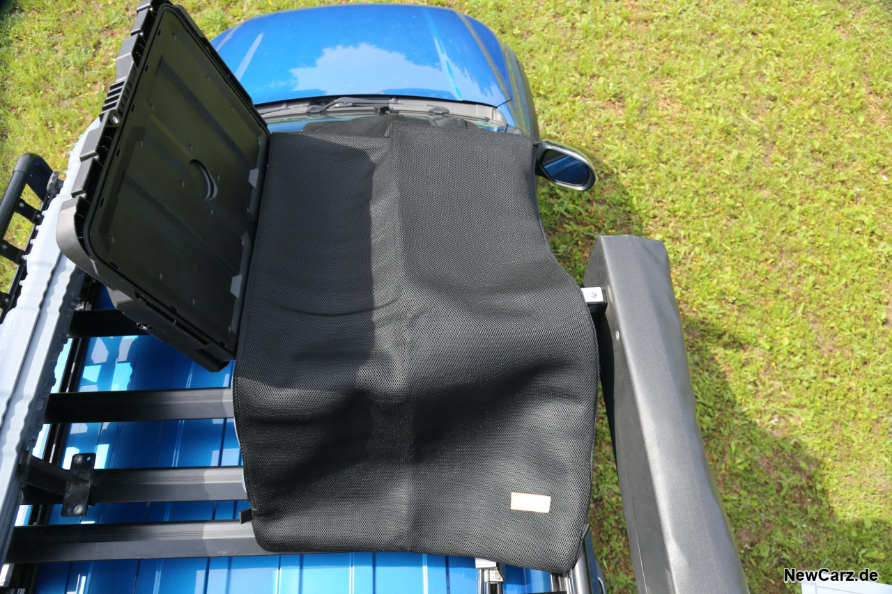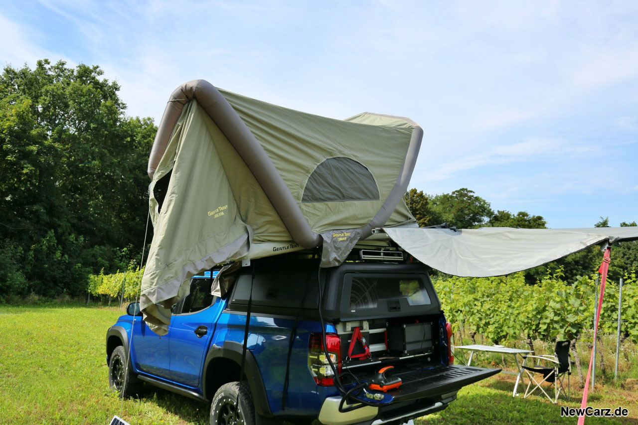 Auf besagtem Rack waren im Fall unseres Testwagens diverse Komponenten montiert. Dazu gehören eine große Kiste mit Schlafsäcken, Sandbords für ein sicheres Vorankommen auf losem Untergrund sowie ein großes Dachzelt. Dieses lässt sich nach dem Befreien aus der Regenschutzhülle einfach per dazugehörigen Kompressor aufblasen, was im Test in weniger als einer Minute erledigt war.