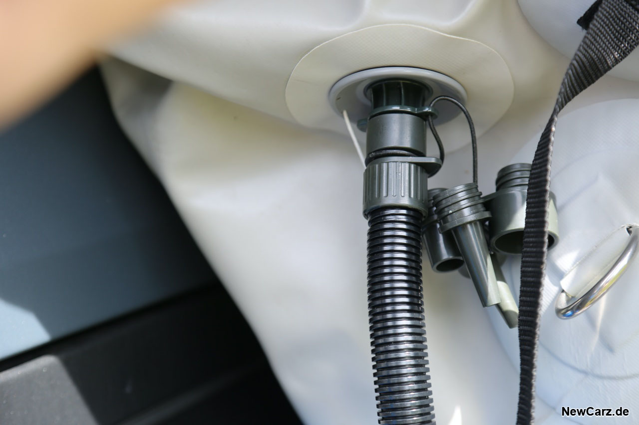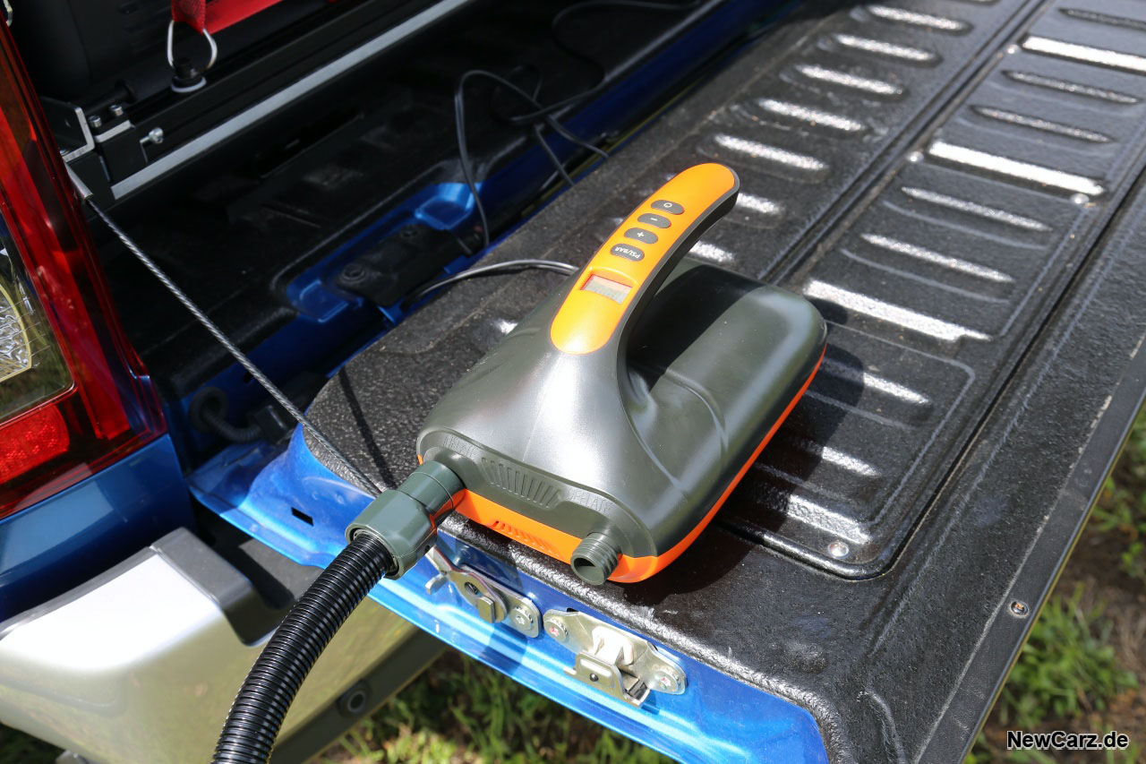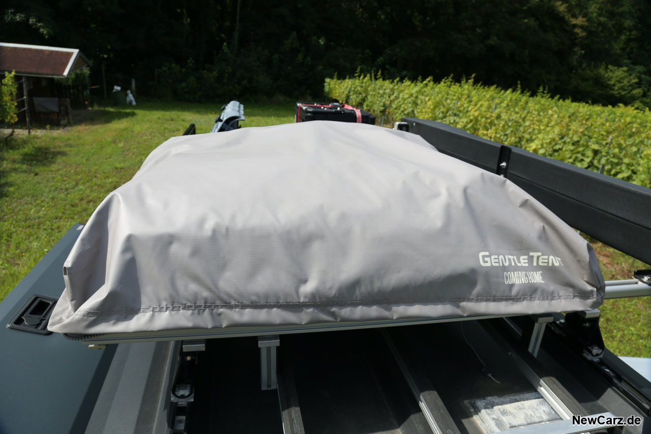 Auf besagtem Rack waren im Fall unseres Testwagens diverse Komponenten montiert. Dazu gehören eine große Kiste mit Schlafsäcken, Sandbords für ein sicheres Vorankommen auf losem Untergrund sowie ein großes Dachzelt. Dieses lässt sich nach dem Befreien aus der Regenschutzhülle einfach per dazugehörigen Kompressor aufblasen, was im Test in weniger als einer Minute erledigt war.