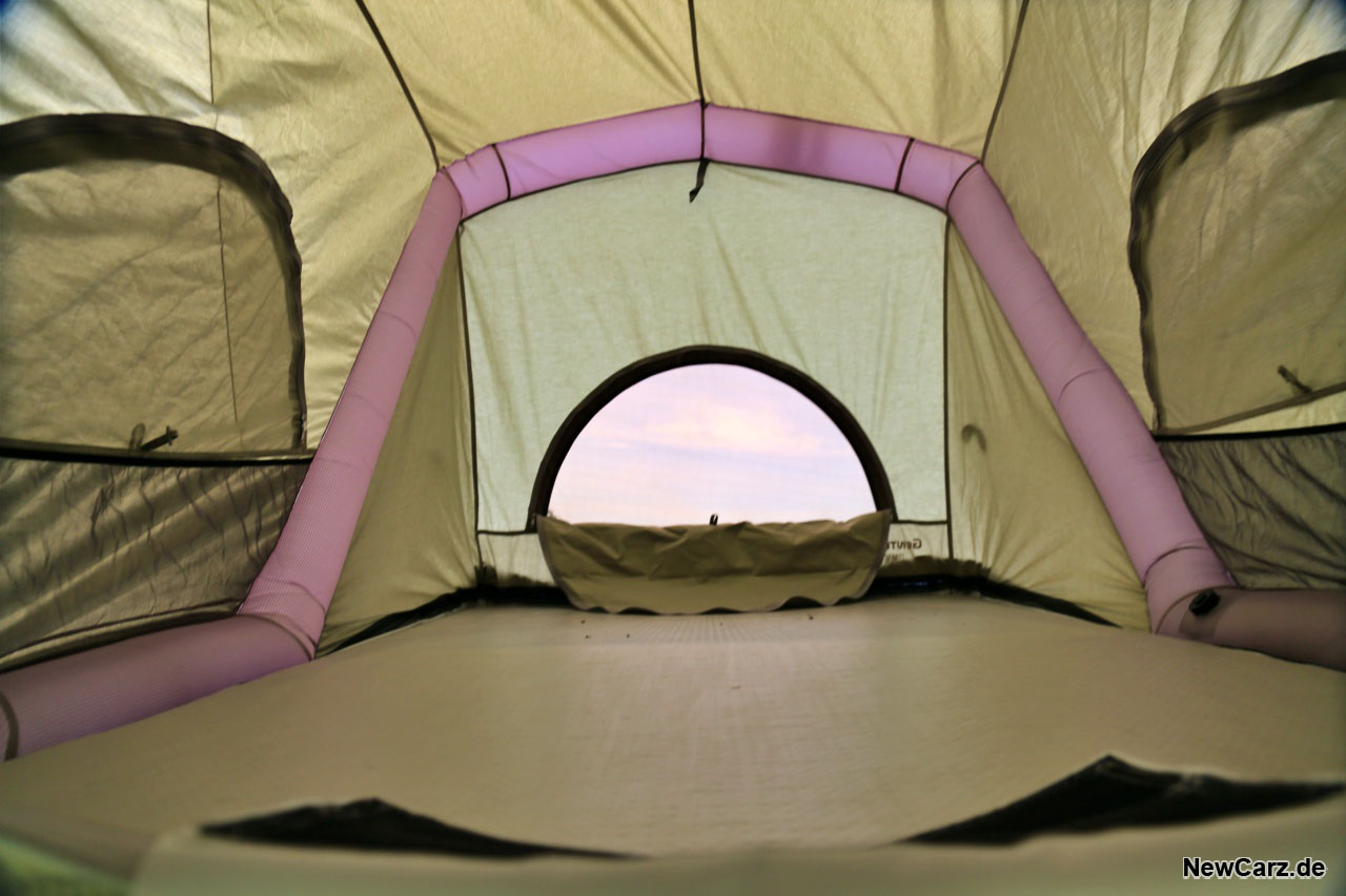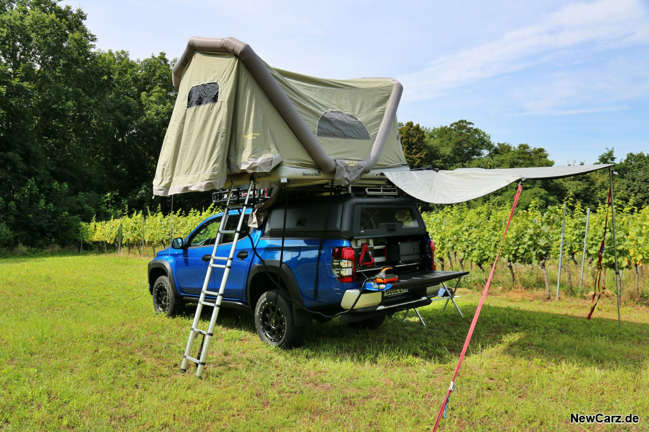 Am Ende muss man nur noch die Teleskop-Aluleiter anbringen – diese ist ebenfalls an der WORKS-Schublade untergebracht – und das Nachtlager ist beziehbar. Der Platz im Zelt reicht bequem für zwei Personen. Zur Not bringt man hier sogar eine dritte Person mal für eine Nacht unter.