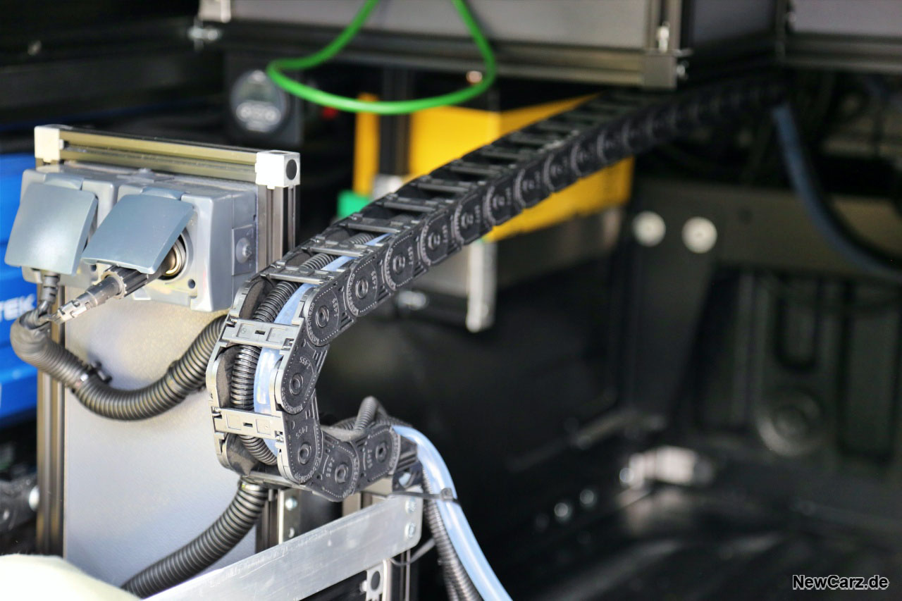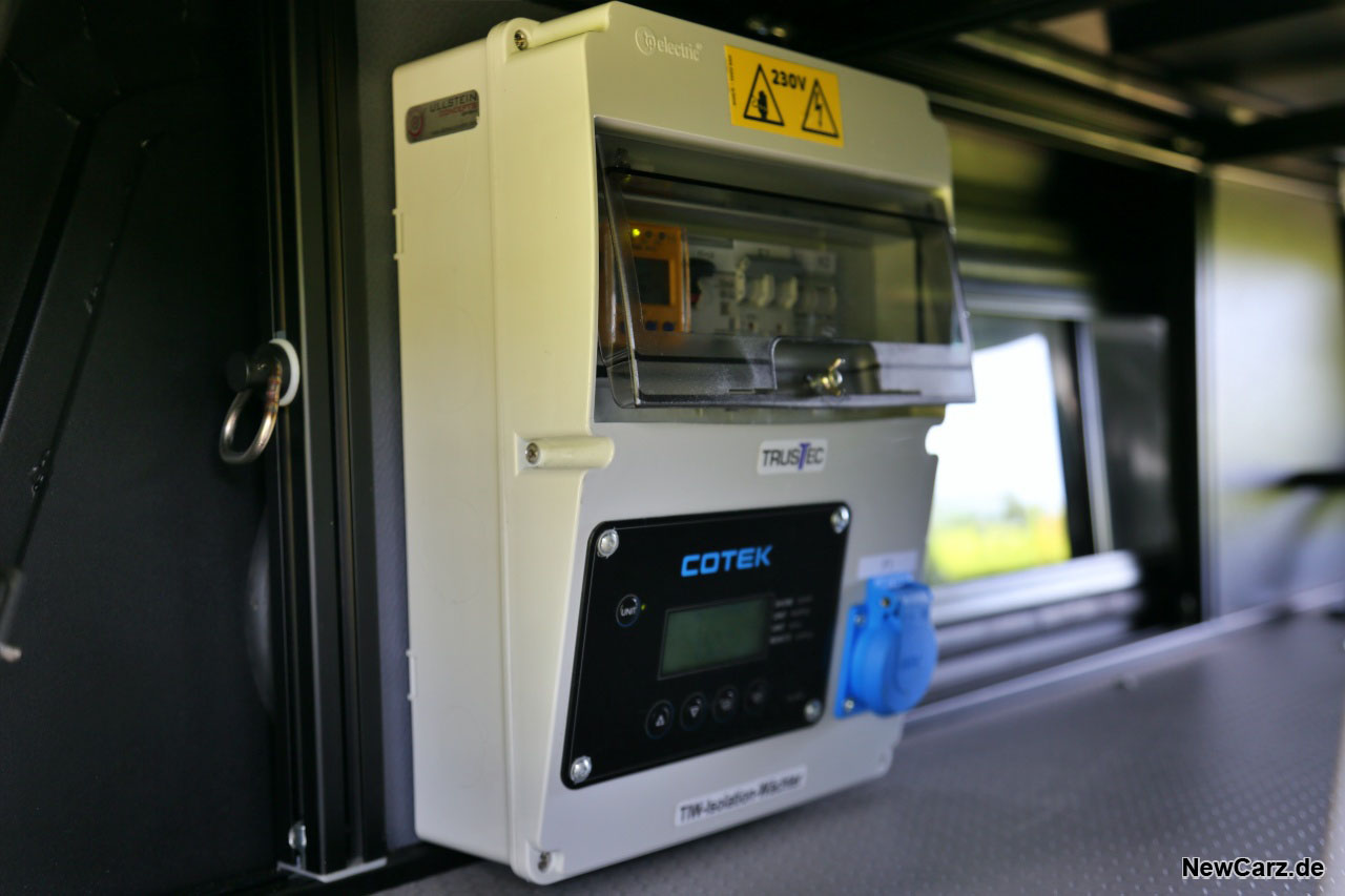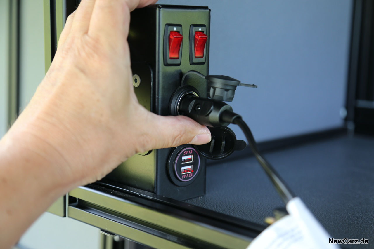 An allen drei Seiten des geöffneten Hardtops befinden sich LED-Lichtleisten, um auch bei Dunkelheit stets die Übersicht zu behalten. Die Stromversorgung übernimmt ein Konverter, der das 12-Volt-Bordnetz zusätzlich auf 230 Volt transformiert und dadurch eine Vielzahl an Verbrauchern mit Energie beliefern kann.