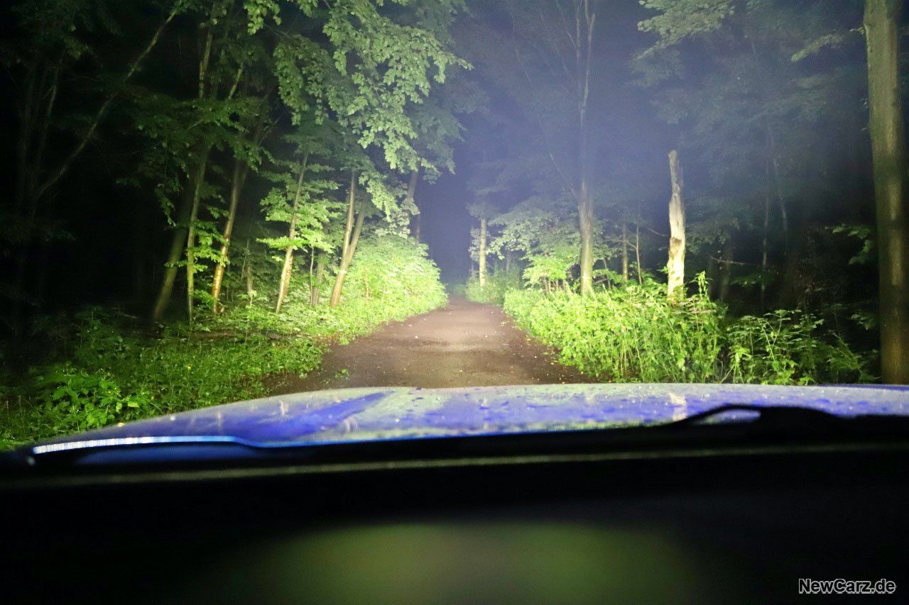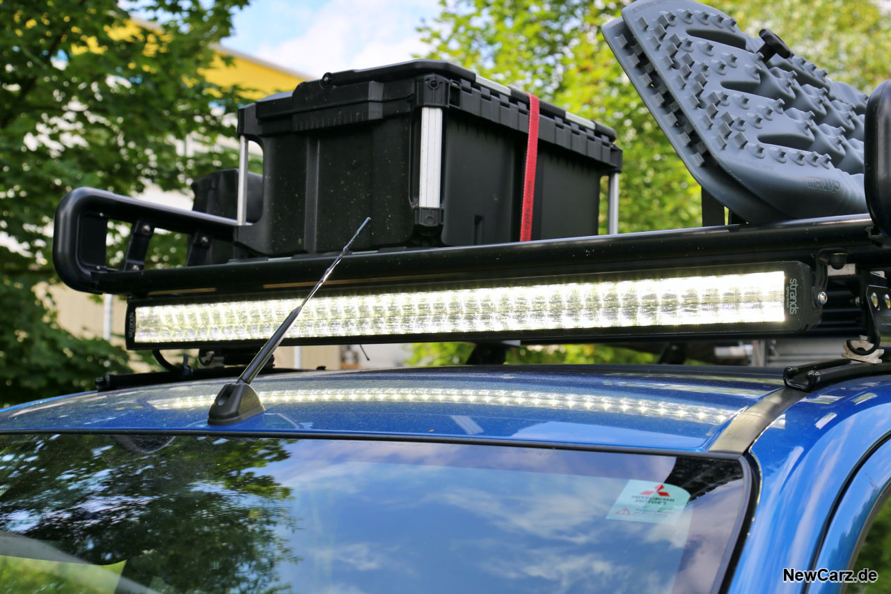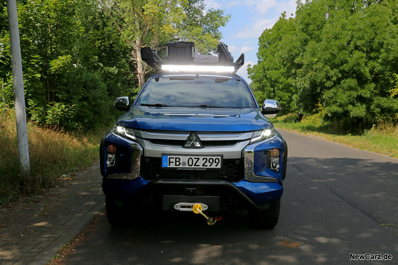 Unbedingt erwähnenswert ist die Lichtanlage des L200 Explorer. Neben den bereits serienmäßigen Voll-LED-Scheinwerfern ist hier eine Lichtleiste angebracht worden, die alle bisher getesteten Scheinwerfer gnadenlos und im wahrsten Sinne des Wortes in den Schatten stellt. Dieses Band aus Hochleistungs-LEDs leuchtet den Bereich vor dem Fahrzeug auf rund einen Kilometer Länge komplett aus.