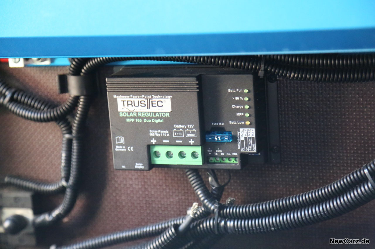 Damit man die Bordbatterie nicht ständig über den Motor nachladen muss, gibt es ein zusätzliches Solarpanel mit separater Batterie, das bei Tageslicht und insbesondere bei Sonnenschein das Stromnetz mittels Inverter mit bis zu 100 Watt versorgt. Falls ein Mobilfunkturm im Regenwald steht, sichert zudem ein integrierter Wifi-Hotspot den Kontakt zur Außenwelt.