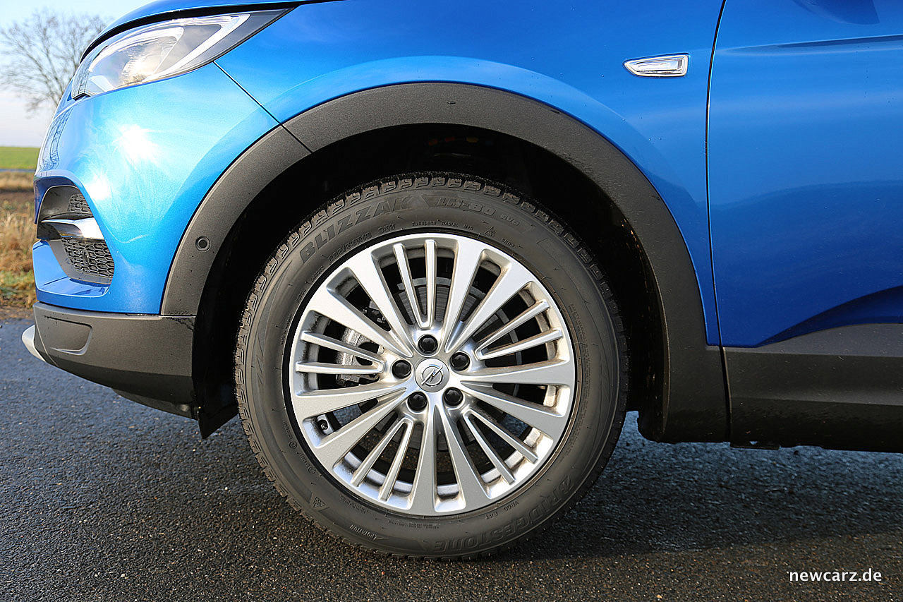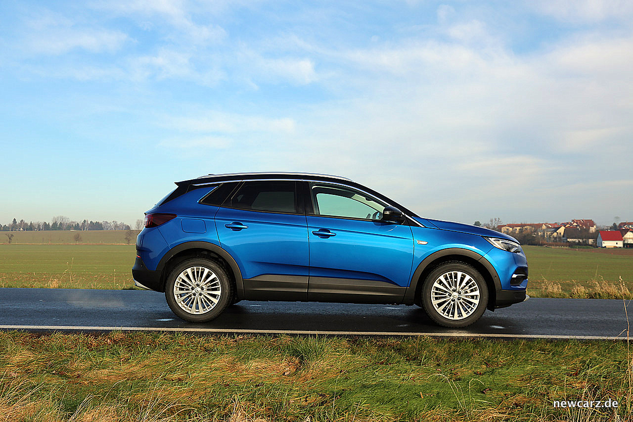 Seitlich betrachtet, fallen zunächst die hohe Gürtellinie und die markanten Bügelfalten auf. Große 18-Zoll-Räder weisen darauf hin, dass der Grandland mit seinem Namen nicht übertreibt. Insgesamt wirkt die Seitenlinie stimmig und wie aus einem Guss.