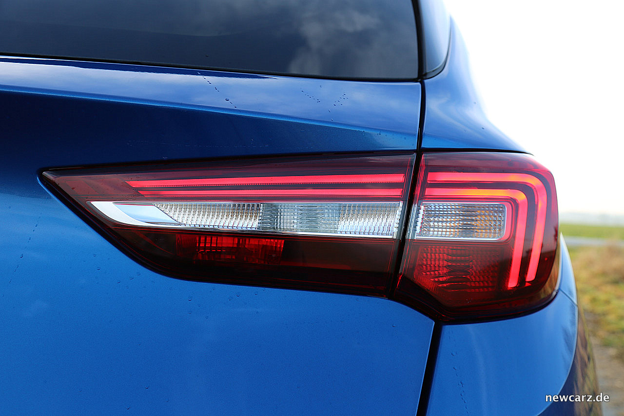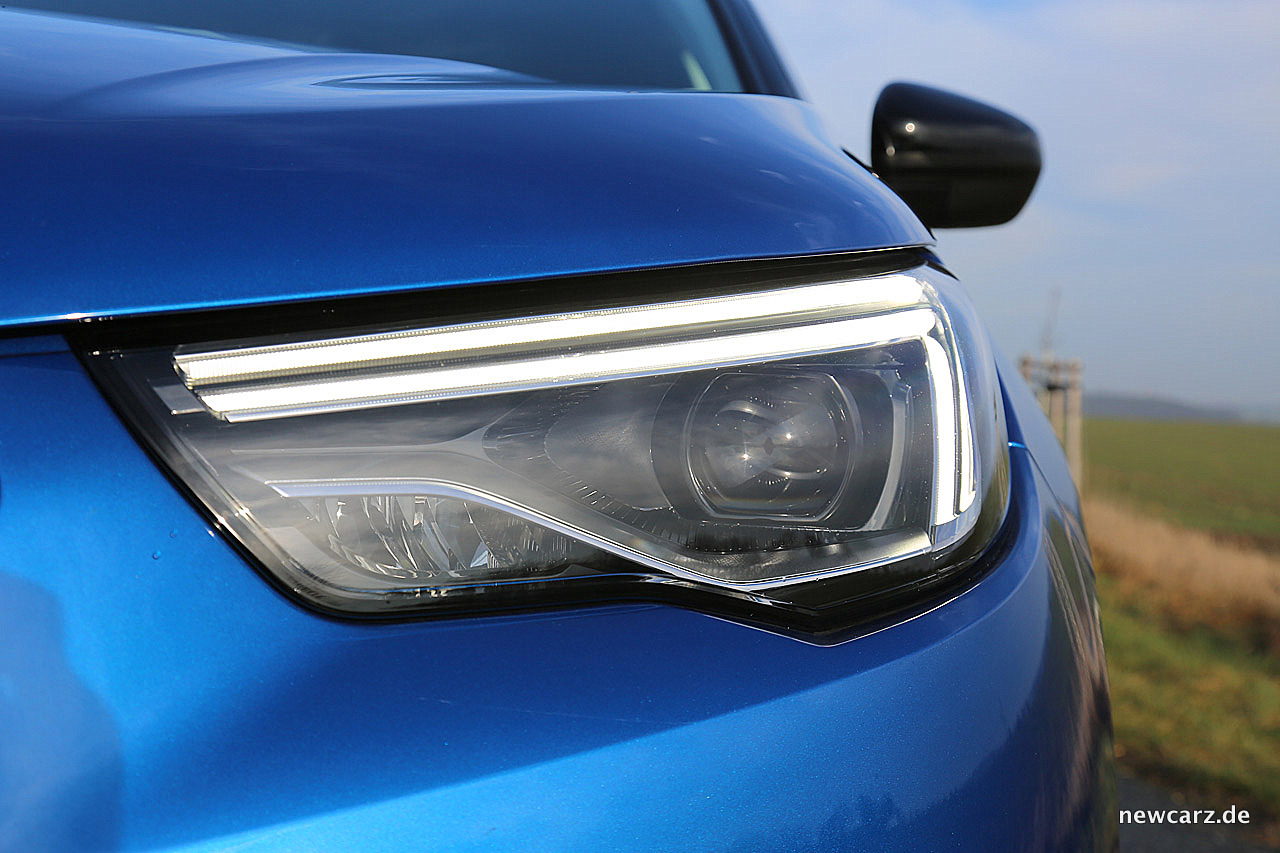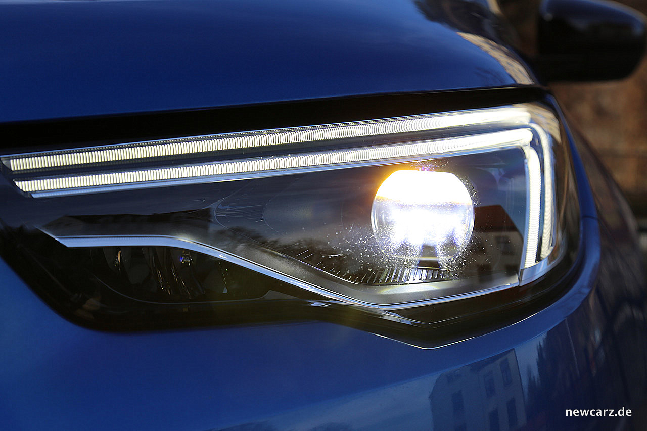 Die adaptiven LED-Scheinwerfer verfügen zwar nicht über eine Matrix-Funktion, dafür passen sie sich jedoch der Fahrsituation an und erhöhen zum Beispiel die Reichweite auf der Autobahn. Insgesamt ist das Licht sehr homogen und glänzt mit enormer Helligkeit. Eine Scheinwerferreinigungsanlage ist nicht an Bord, dafür aber eine automatische Leuchtweitenregulierung. Im Übrigen verfügt der Opel über ein extrem gut ausleuchtendes Abbiegelicht, dass selbst kleinste Gegenstände oder Hindernisse beim Abbiegen sichtbar werden lässt.