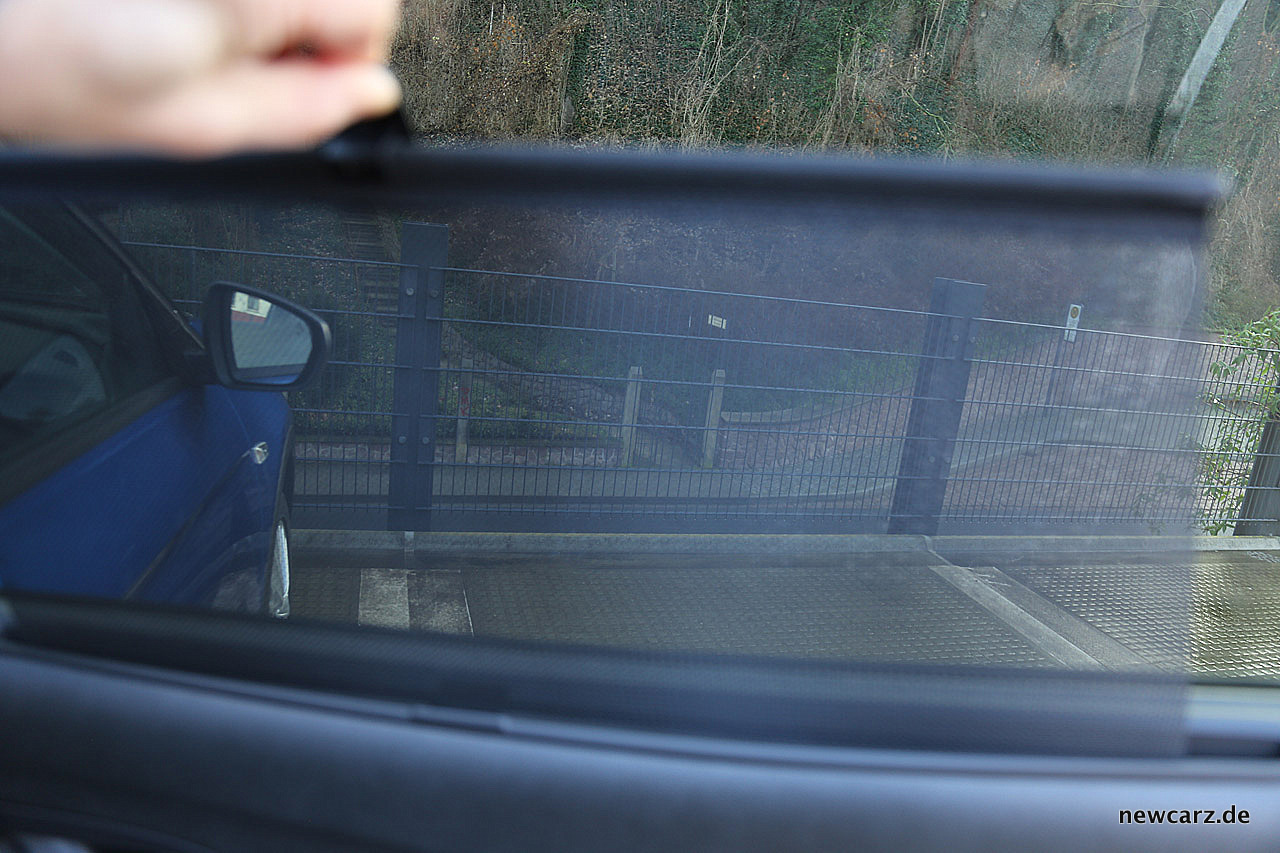 Durch die leicht erhöhte Sitzposition ergibt sich eine gute Übersichtlichkeit nach vorne. Rückwärtig behindert das sich deutlich zum Heck verjüngende Greenhouse die Rundumsicht deutlich. Enorme Einschränkung derselben bewirken die massiv erscheinenden C- und D-Säulen, welche ineinander verlaufen und nur ein marginal erscheinendes Fenster von der Größe einer Schießscharte als Trennmittel aufweisen.