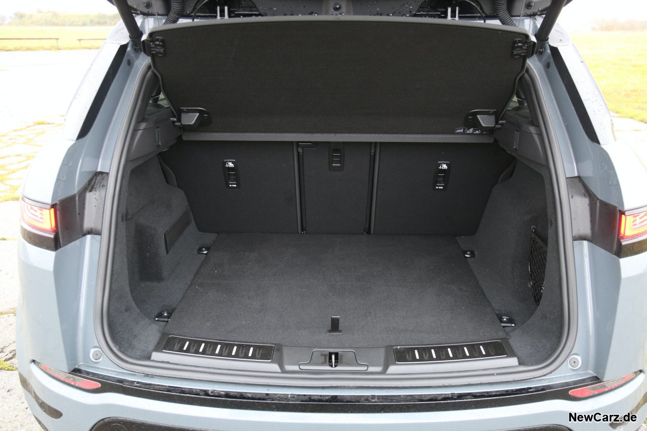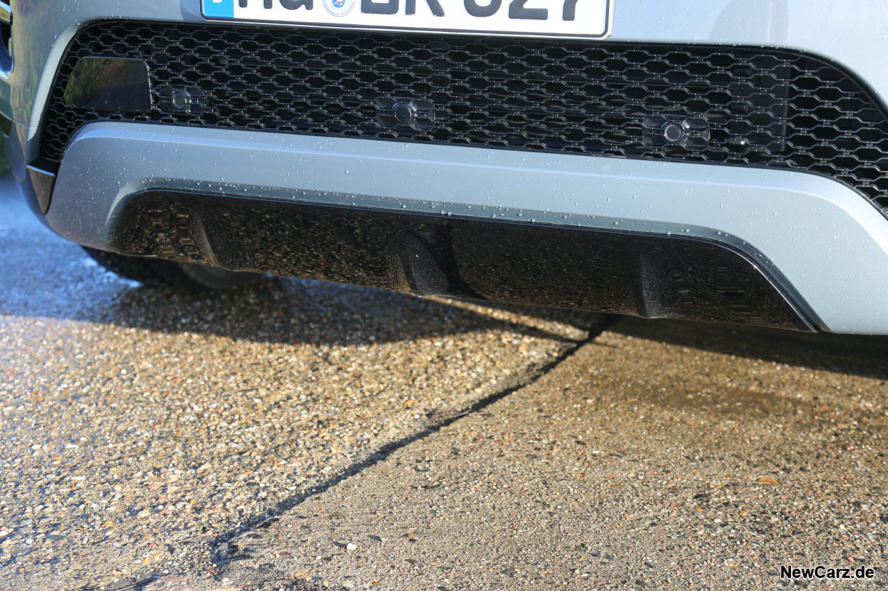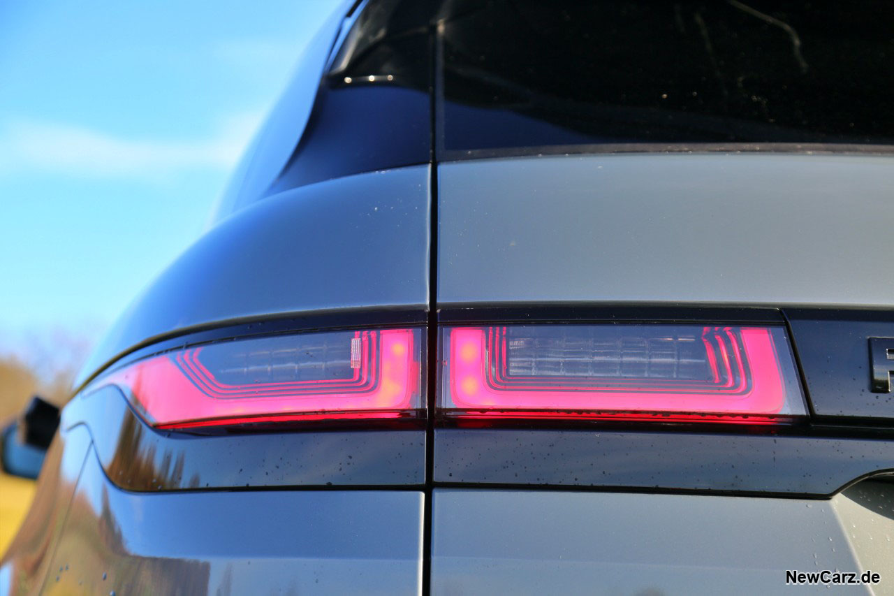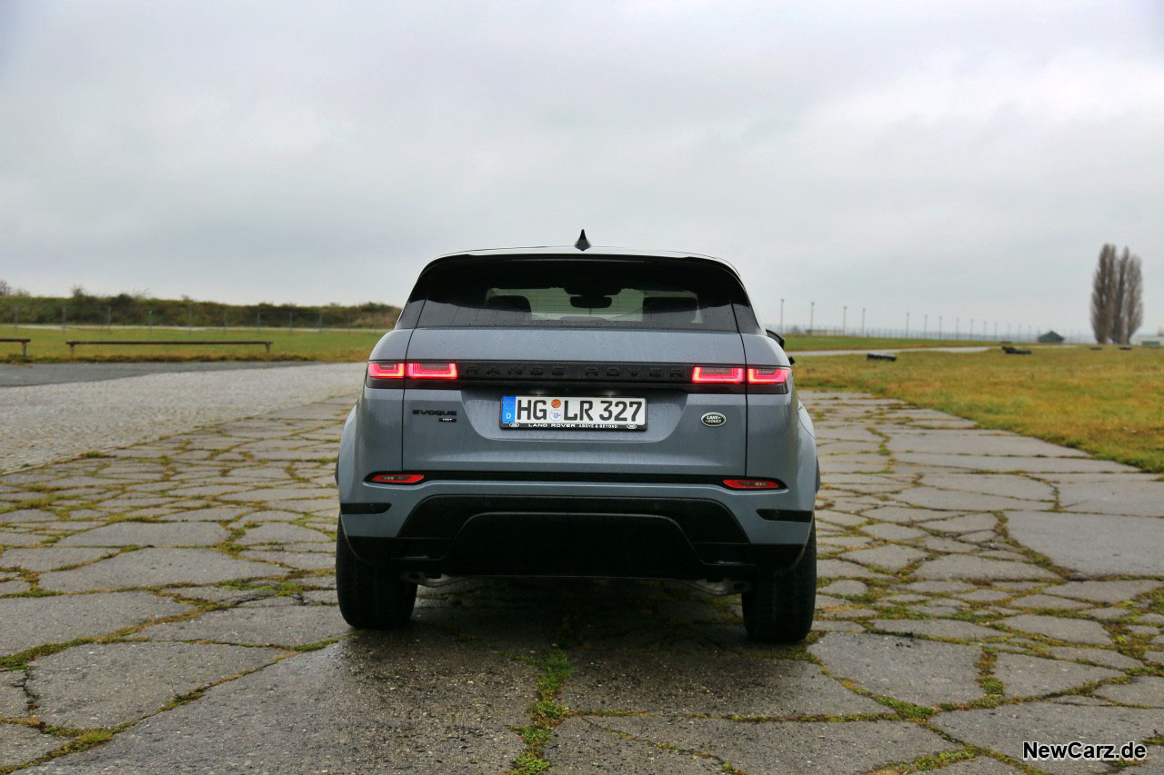 Am Heck erwarten den Betrachter hübsche Lichtsignaturen in sehr schmalen Rücklichtern und der tiefschwarze Heckdiffusor verströmt eine Extraportion Dynamik. Übrigens besitzt der Range Rover Evoque P300 das gleiche Überholprestige wie seine deutlich größeren Geschwister. Das spürt man auf der Autobahn, auf der man dem kleinen Range fast immer demütig die linke Spur freigibt – man sieht selbst als Kenner nicht sofort im Rückspiegel, dass es sich um den Kleinsten der Range-Liga handelt.