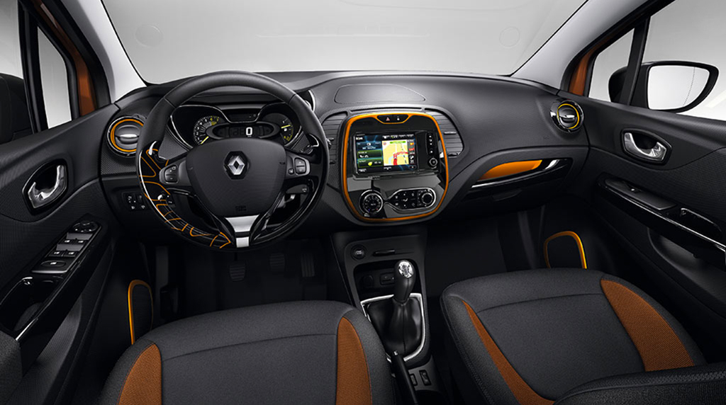 Der Innenraum wirkt klar und aufgeräumt. Obwohl der Renault Captur nur ein wenig länger ist als sein kleiner Bruder, ist es im Inneren sehr geräumig. Eine verschiebbare Rückbank bietet die Möglichkeit zwischen mehr Beinfreiheit oder mehr Kofferraum zu wählen, die erhöhte Sitzposition des Fahrersitzes sorgt für mehr Überblick beim Fahren. Auch der Innenraum lässt sich individualisieren. So kann zwischen verschiedenen Stoffbezügen und Highlight-Farben gewählt werden. Der Kofferraum bietet je nach Position der Rückbank ein Volumen von 377 bis 455 Liter.