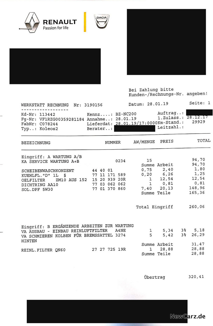 Nach knapp 30.000 Kilometern musste unser Dauertestkandidat, der Renault Koleos, erstmals zur Inspektion. Die Informationen hierzu sind wir noch schuldig. Dabei handelte es sich um einen Werkstattaufenthalt, der laut Wartungs- und Serviceplan durchgeführt werden muss.