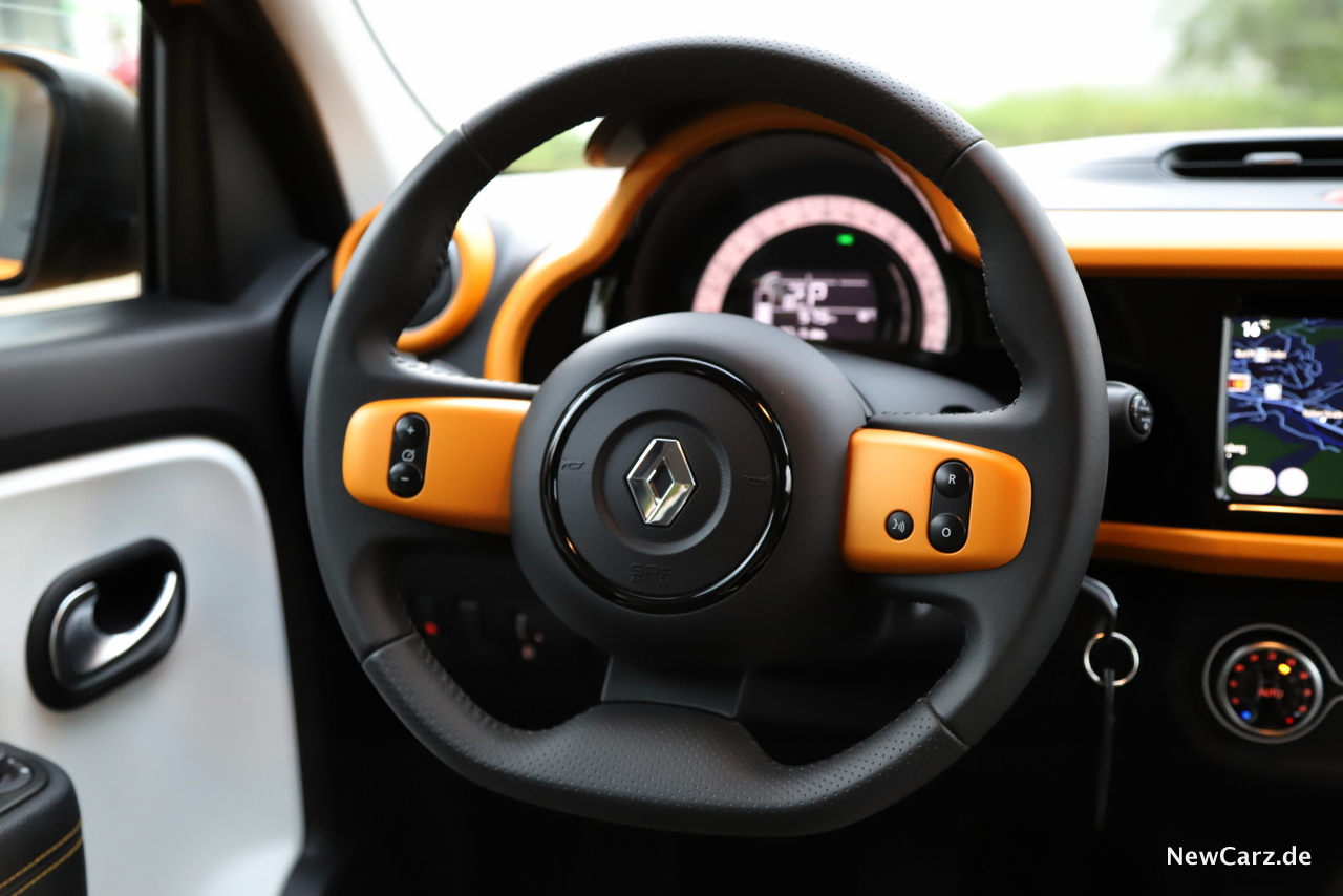 Insgesamt stehen für den Renault Twingo Electric aktuell drei Ausstattungslinien zur Wahl. Wir fuhren die mittlere Linie mit dem Namen „Intens“, die bereits eine recht umfangreiche Optionsliste bereithielt. So rollt diese Linie bereits mit einem Infotainment samt 7-Zoll-Bildschirm, einer zugfrei arbeitenden Klimaautomatik, einem Tempomat sowie elektrischen Außenspiegeln zum Kunden. Außerdem dabei ist ein Licht- und Regensensor und ein Lederlenkrad.