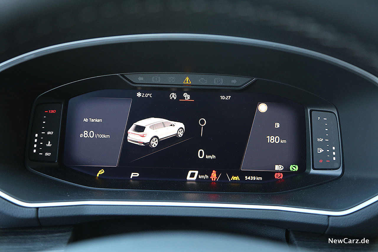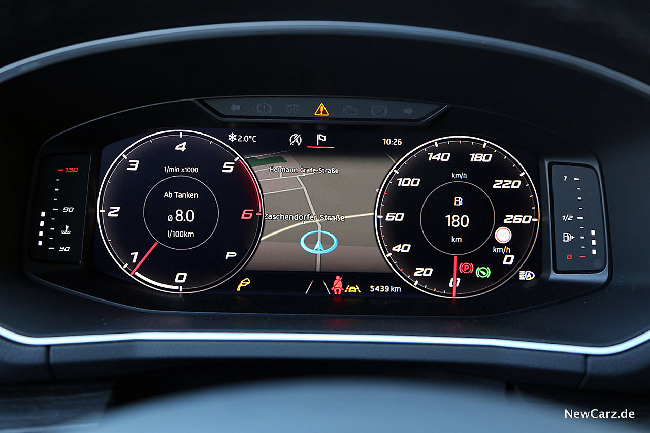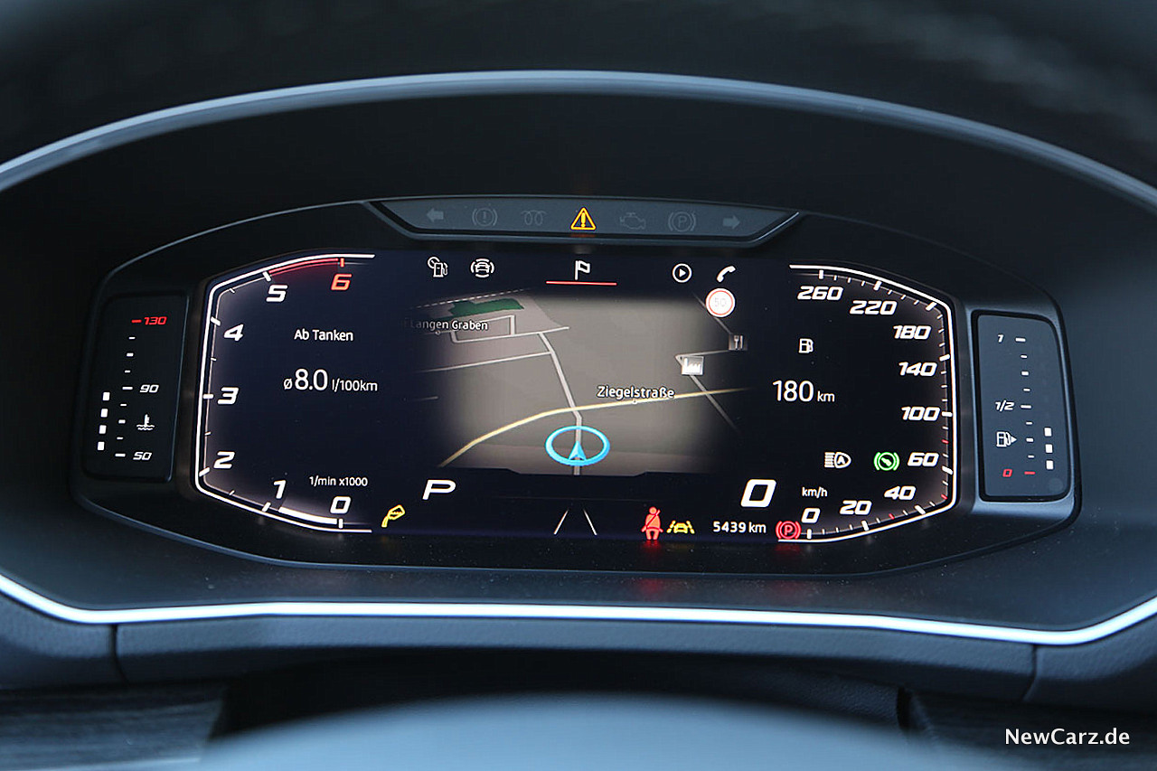 Das volldigitale Instrumentendisplay verwendet bei seiner Darstellung „blurred lines“, wodurch das Dargestellte mit dem Hintergrund verschwimmt. So entsteht beispielsweise um das angezeigte Cover eines Musiktitels eine wattierte Rahmung. Dies sieht wirklich toll aus.