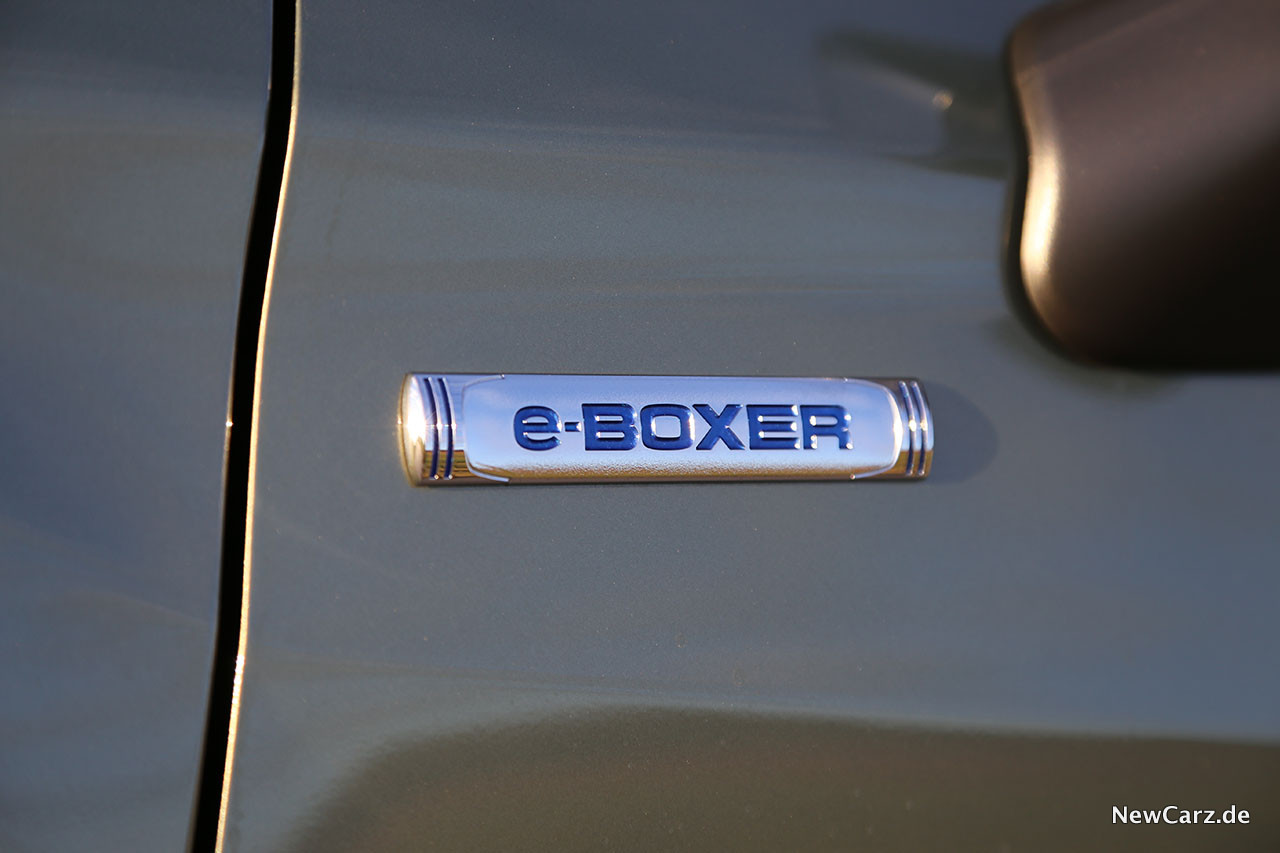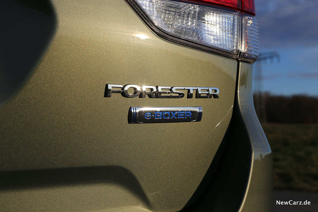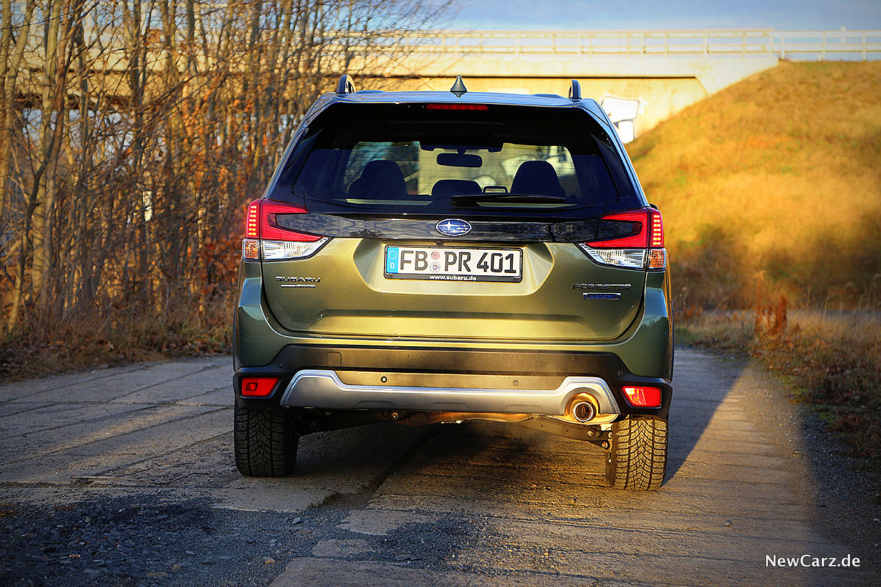 Das Heck wird durch die massive Heckklappe, den deutlich hübscher designten Heckleuchten und den angedeuteten Unterfahrschutz dominiert. Das Endrohr der Abgasanlage zeigt sich hier sogar in diesem eingebunden, was in der Fahrzeugklasse und an einem Japaner fast schon exotisch anmutet. Klare Hinweise auf den e-Boxer liefern Plaketten an den vorderen Kotflügeln sowie an der Heckklappe.