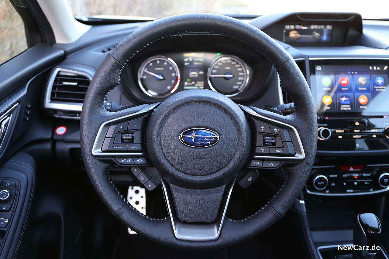 Bodenständig bleibt der Forester weiterhin durch sein klassisches Analog-Cockpit, einem massiven weil mechanisch betätigten Wahlhebel für die CVT-Automatik sowie jeder Menge physischer Bedienelemente wie Drehregler und echten Schaltern oder Tasten – sehr schön.