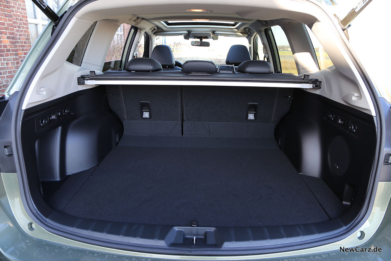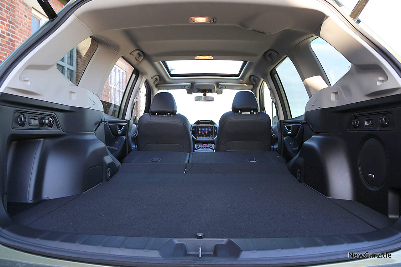 Die Materialanmutung kann sich absolut sehen lassen, nach sparwütigem Rotstift sieht es nirgends im Forester aus. Der Kofferraum wird durch die Hybridtechnik nicht eingeschränkt und bietet mit seinen 509 Litern bereits in Standardkonfiguration genügend Platz für so gut wie alle Erfordernisse des Alltags.