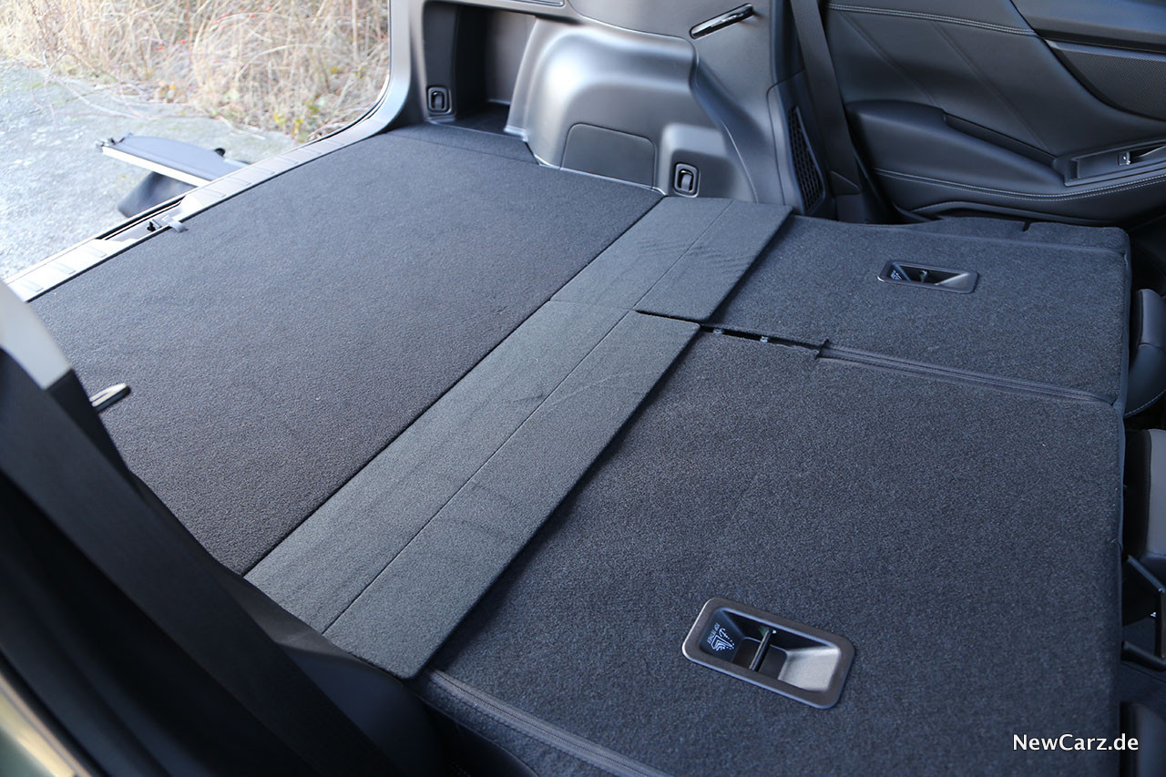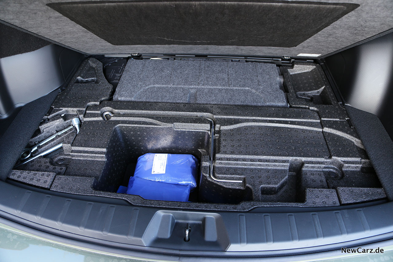 Klappt man die zweite Sitzreihe komplett um, werden dachhoch bis zu 1.779 Liter frei. Nur ein Ersatzrad ist nicht mehr drin, diesen Platz hat man nun dem Akku vorbehalten.