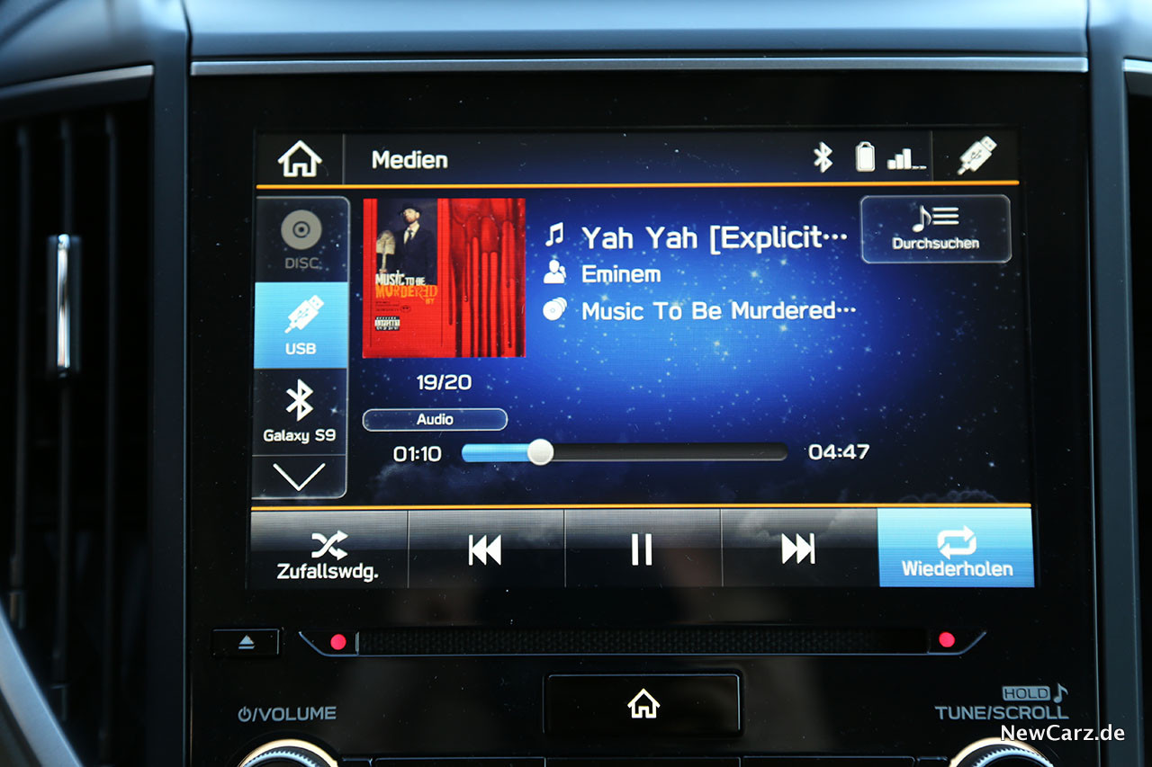 Typisch: Die doppelte Ausführung des Zentraldisplays: Zu dem Center-Screen gesellt sich ein weiterer Assistenzbildschirm darüber, den wir auch aus dem Subaru XV oder dem Levorg kennen.