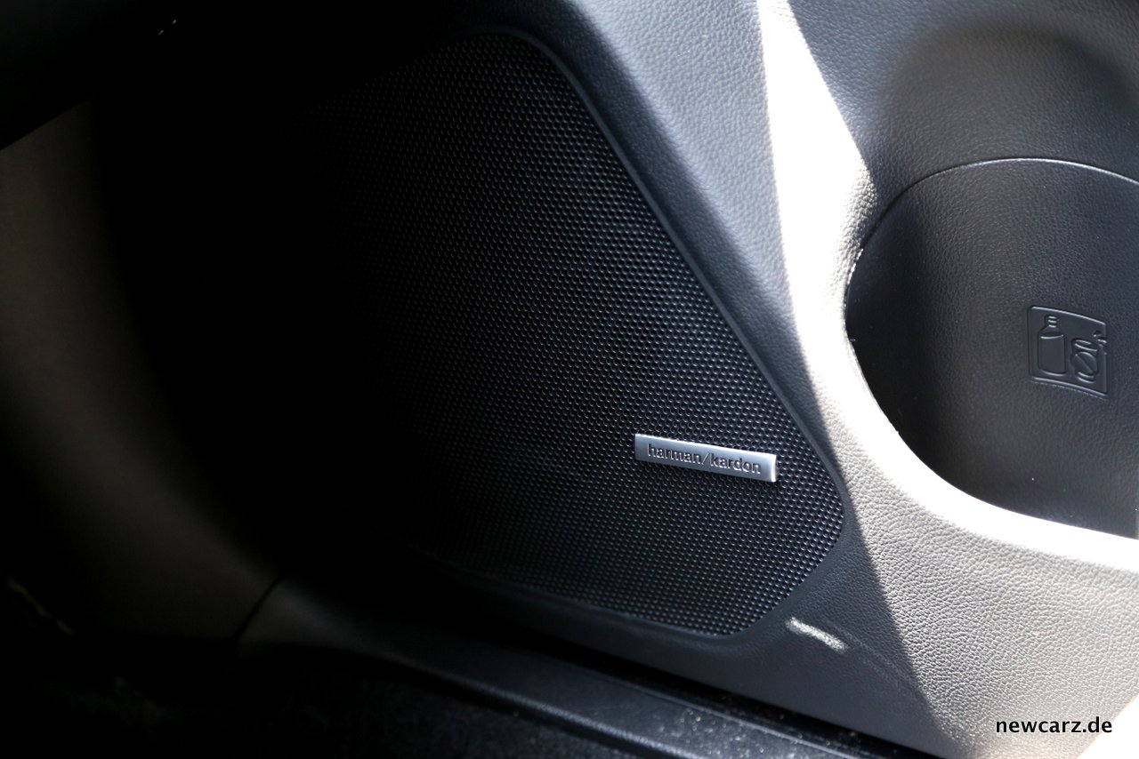 Während das Handy in einem großformatigen, gummierten Ablagefach nebst USB-Slot ruht und aufgeladen wird, genießt der Fahrer das musikalische Reiseentertainment. Aus gleich 12 Lautsprechern von Harman/Kardon flutet ein satter und zeitgleich glasklarer Sound den Innenraum.