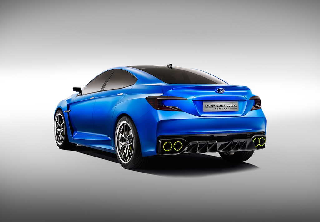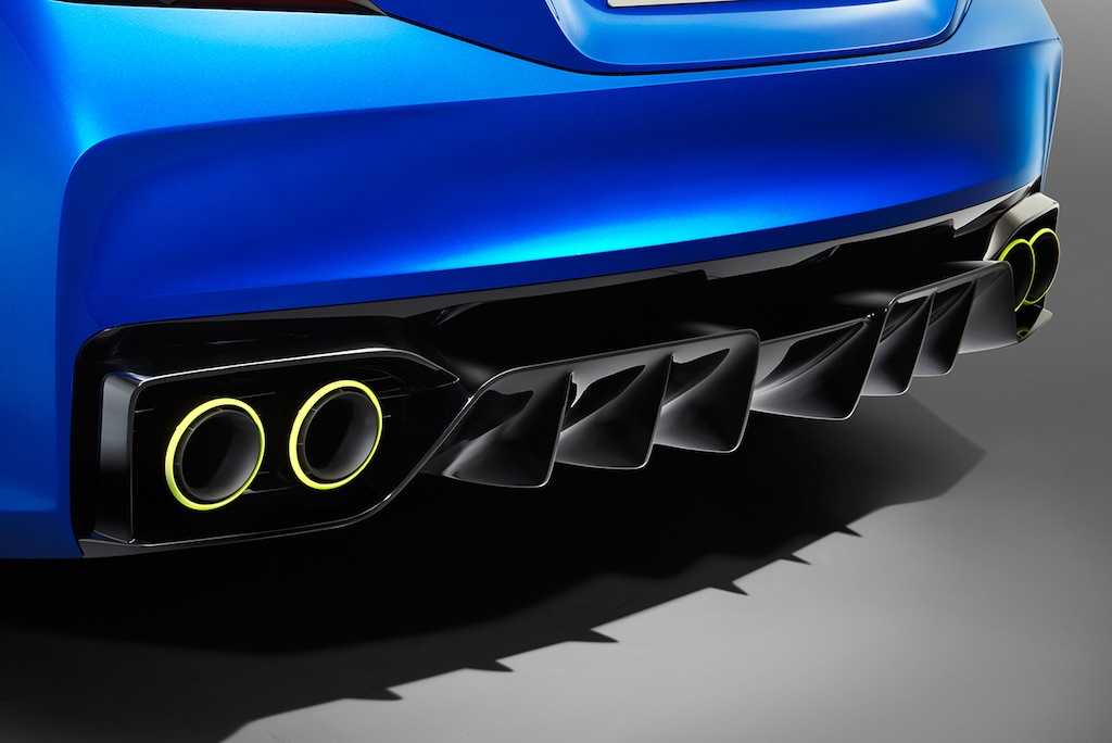 Am Heck fehlt auf den ersten Blick ein kleiner Spoiler. Eventuell kann der noch optional hinzugebaut werden, sollte der Subaru WRX in Serie gehen. Statt eines richtigen Spoilers zeigt das Heck eine leicht spoiler-artige Form. Vier dicke Auspuffrohre sollen die Power symbolisieren, welche das Gefährt hoffentlich haben wird. Nicht zu übersehen ist auch der aggressiv gestaltete Diffusor, der die Aerodynamik verbessern soll.