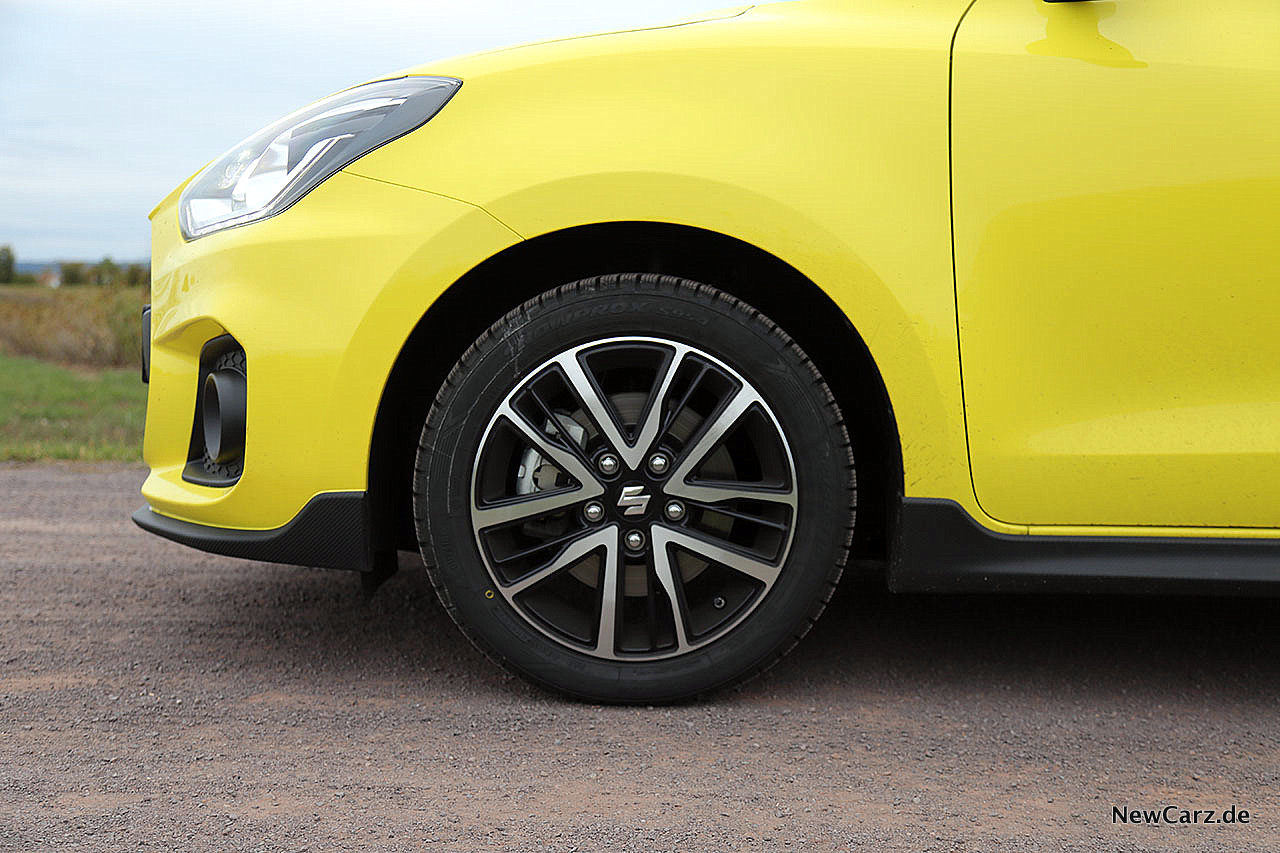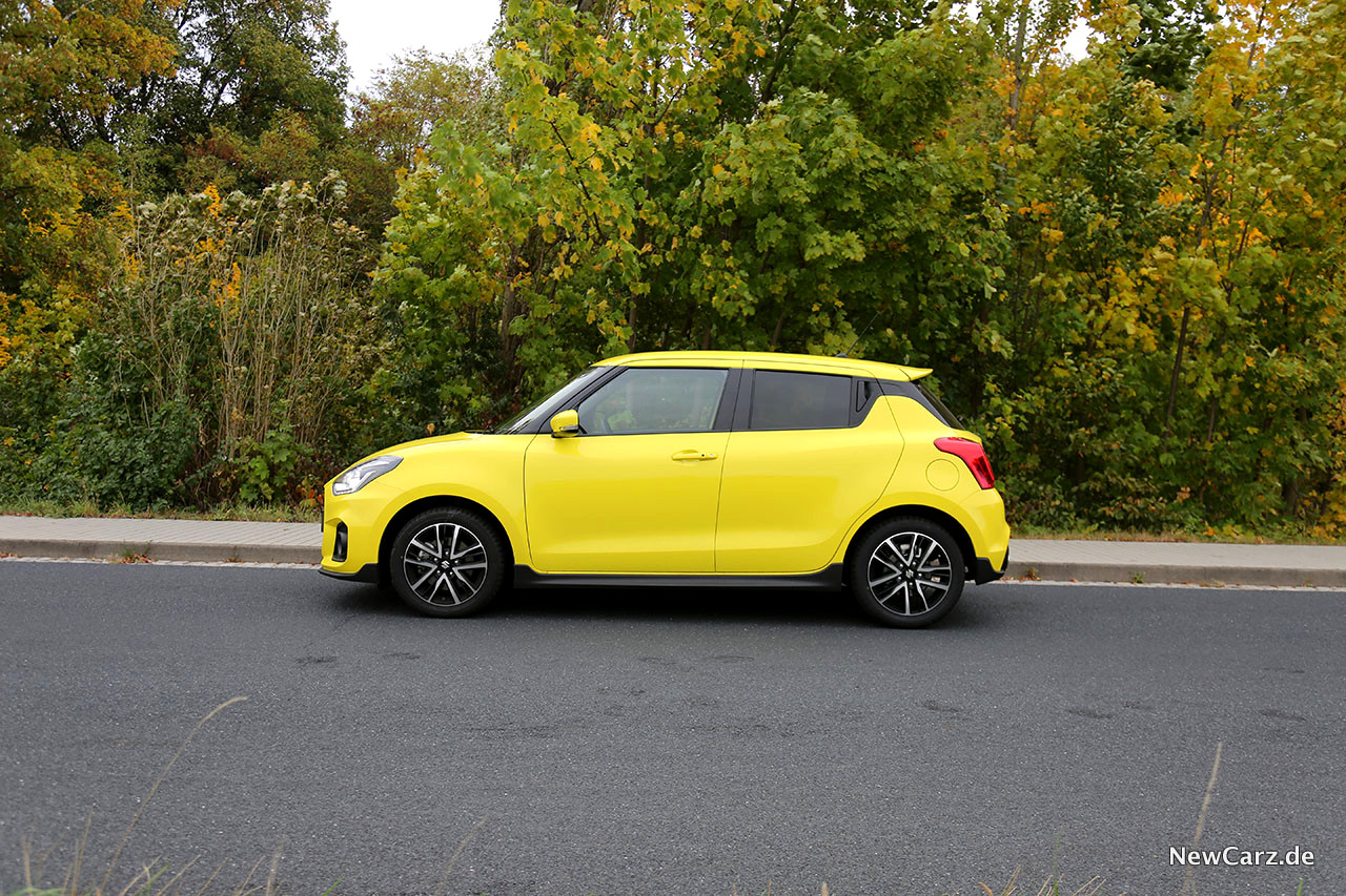 Weiterhin fallen neben der sportiv angereicherten Front auch die schicken 17-Zoll-Felgen auf, die unseren Testwagen stylisch auffrischten. Ebenso auffällig wirken die Seitenschweller, der Heckdiffusor und die Frontspoilerlippe, allesamt in Carbon-Optik gestaltet. Nur die Seitenlinie – aus etwas mehr als neun Uhr betrachtet – erinnert ein bisschen an einen Mini und lässt mit viel Blech und wenig Felge den Swift optisch ein klein wenig pummelig erscheinen.