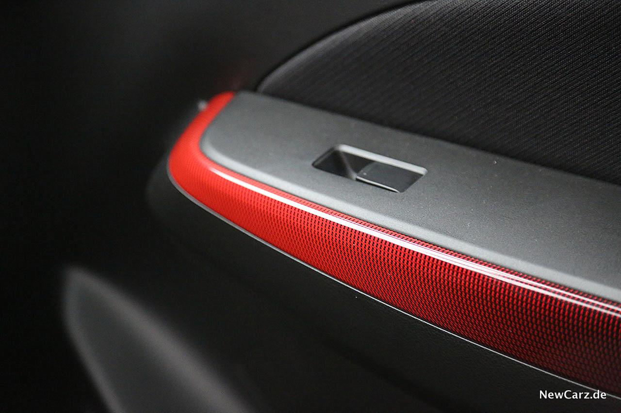 Im Innenraum des Suzuki Swift Sport geht es kontrastierend rot zu. Überall präsentieren sich rote Akzentnähte und feurigrotes Dekor in Karbon-Design koloriert das Interieur mit Pepp. So wird der sportliche Anspruch erfolgreich von Anbeginn an den Betrachter kommuniziert.