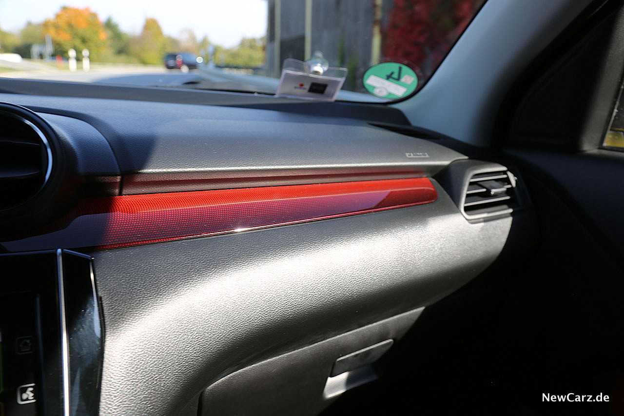 Gute Assistenzarbeit leistete der Spurverlassenswarner, der bei ungeplantem Spurwechsel oder überfahrener Linie dies mit vibrierendem Lenkrad und visuellem Hinweis im Cockpit quittierte. Die Treffergenauigkeit war im Test erstaunlich exakt.