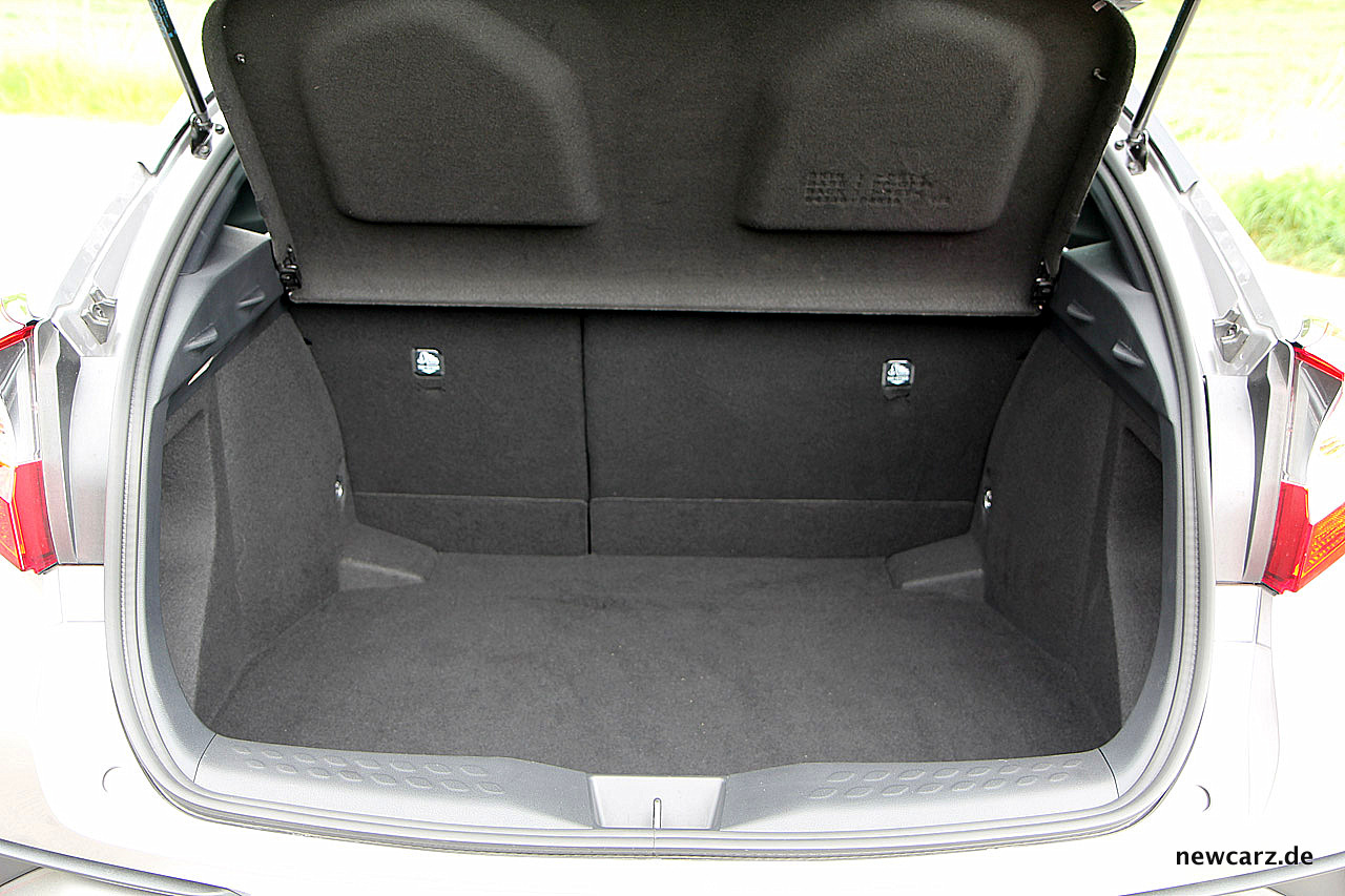 Auch der Gepäckraum bietet mit 377 Litern eine für diese Fahrzeuggröße recht bescheidene Ladefähigkeit. Etwas über 1.100 Liter werden es, wenn man die Rücksitzlehnen umklappt, was eine zwar nicht ebene Ladefläche offenbart, jedoch zu etwas mehr Volumen beiträgt.