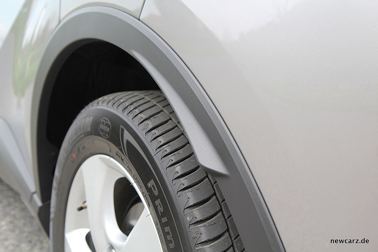 Der Toyota C-HR vermag bereits im Stand eine optische Aufgeregtheit zu versprühen. Zwei Karosserievarianten in einem Auto vereint – das gab es so noch nicht. Seine elegante Linienführung und die Dachlinie – sehr stark einem Coupé nachempfunden – vereinnahmt den Betrachter auf den ersten Blick. Ungefähr ab der Gürtellinie bildet eine schwungvolle Kantenführung aus den enorm herausgestellten Radhäusern eine kosmetisch optimierte Naht zum Unterbau, welcher eindeutige SUV-Gene kommunizieren kann.