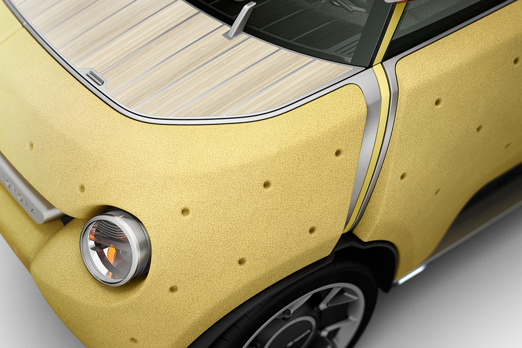 Von Außen bietet das Design keine Höhepunkt. Die kleinen Glubschaugen – entschuldigung, Scheinwerfer – schauen den Fahrer unschuldig an. Auf dem Dach sowie am Heck und auf der Fronthaube befindet sich eine Holzabdeckung. Diese ist aus Bambusholz gefertigt. Das Bambusholz ist auch im Innenraum zu finden. Der Boden sowie das Armaturenbrett sind aus Holz. Bis auf zwei Sitzbänke, das Lenkrad und ein kleines Display ist jedoch sonst nichts im Innenraum – schließlich soll Gewicht gespart werden.