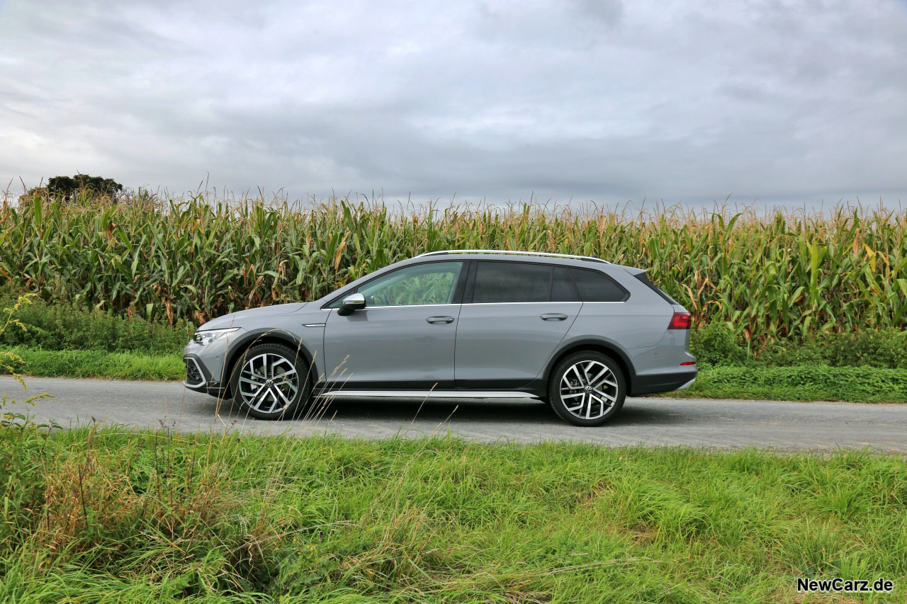 Da der Golf 8 abmessungstechnisch gegenüber dem Golf 7 zugelegt hat, wuchs entsprechend auch der Alltrack in seinen Dimensionen gegenüber seinem Vorgänger. Wir fuhren den leicht hochbeinigen Kombi in einem dezenten Mondsteingrau.