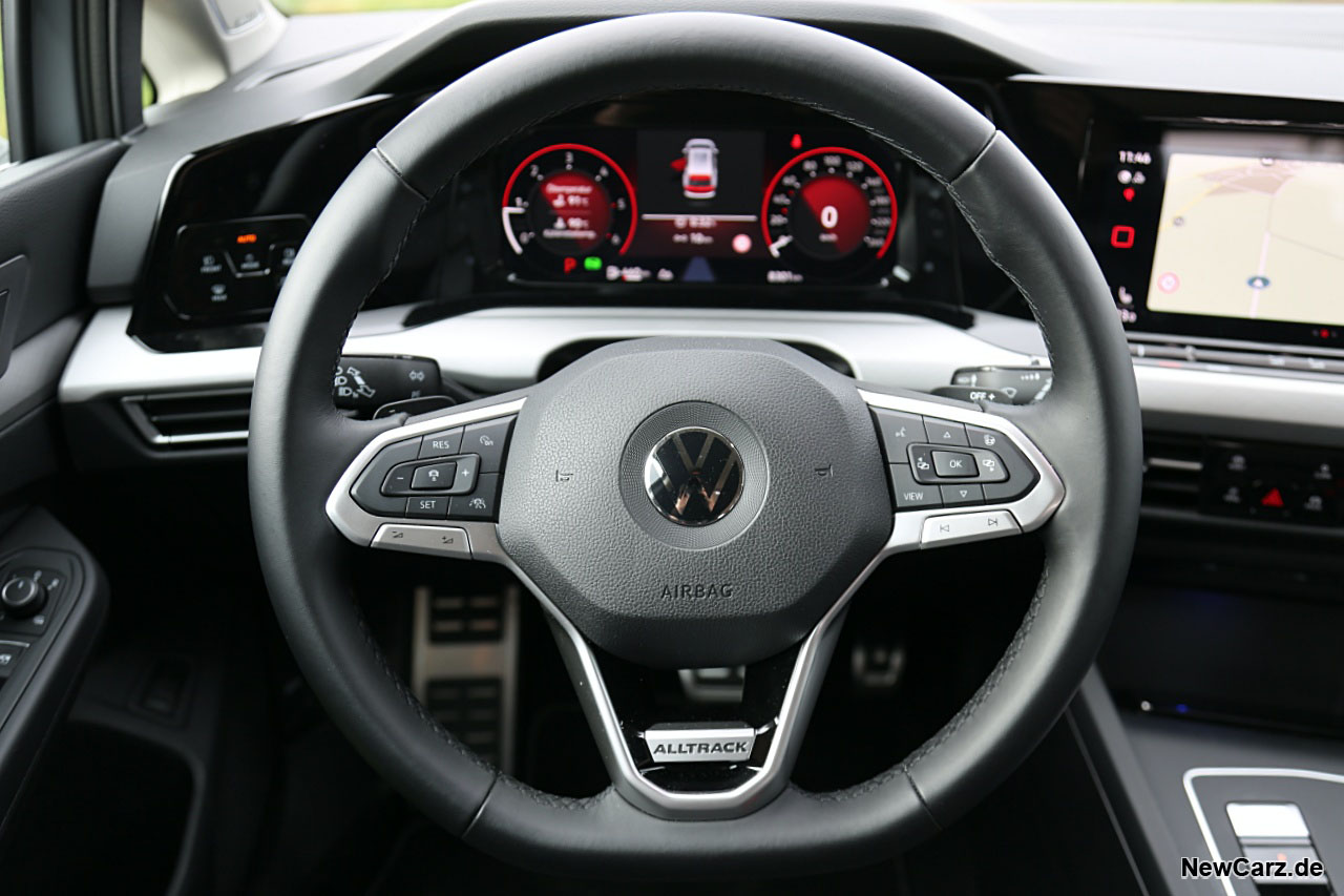 Im Innenraum bleibt alles wie gehabt und das einzige Erkennungszeichen sind Alltrack-Schriftzüge im Lenkrad und auf den Sitzen im ansonsten gleichen Interieur wie dem eines klassischen Golf Variant.