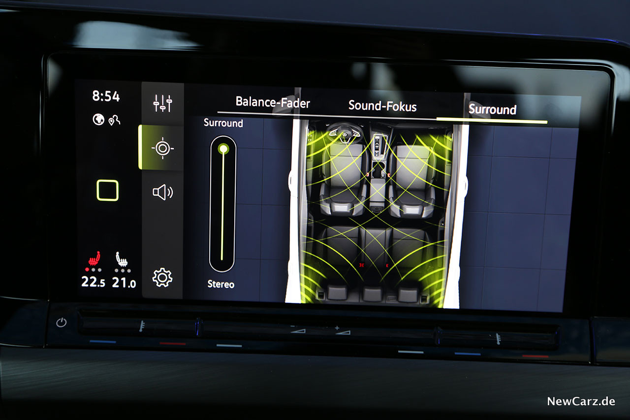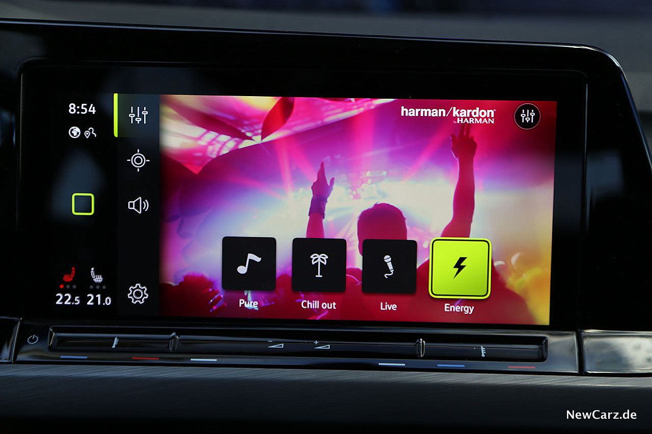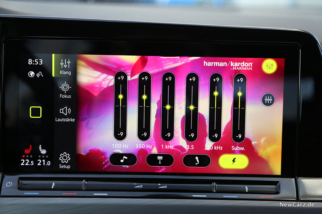Ein weiteres Highlight ist die Harman/Kardon Audioanlage im neuen Golf VIII. Dieses Soundsystem darf mit Fug und Recht behaupten, das aktuell beste Musiksystem in der Kompaktklasse zu sein. Der klare, sehr facettenreiche Klang erfreute die Ohren im Test mit einer Natürlichkeit, die man bei so manchem Hi-Fi-System in zwei Fahrzeugklassen darüber nicht in dieser Feinheit vernehmen konnte.