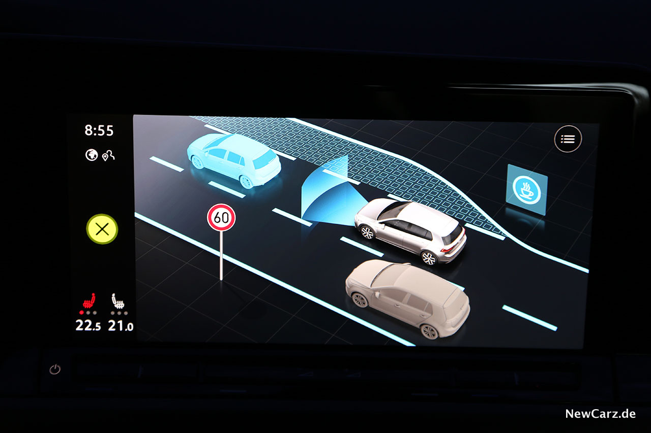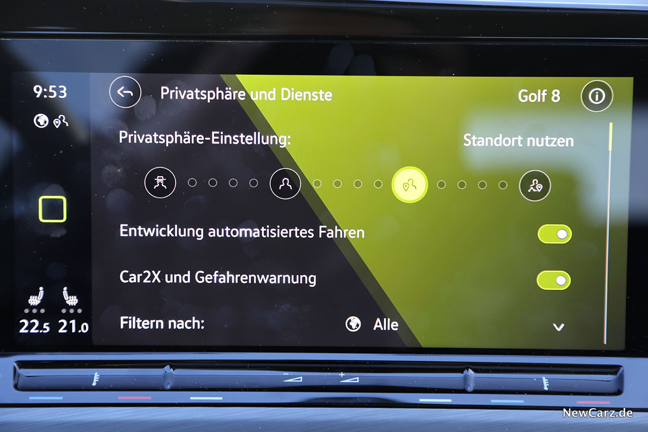 Eine Heerschar an Assistenten unterstützen derweil den Fahrer und erlauben nun auch das vorausschauende Fahren. Dabei verringert der Golf beispielsweise selbstständig die Geschwindigkeit vor Ortschaften, Kurven oder Geschwindigkeitsbeschränkungen und beschleunigt danach wieder. Das System greift hier auch auf die Informationen anderer Verkehrsteilnehmer zurück, wie auch auf die des neuen Golfs. Diese kann man in den Privatsphäre-Einstellungen unter „Entwicklung automatisiertes Fahren“ auch deaktivieren.