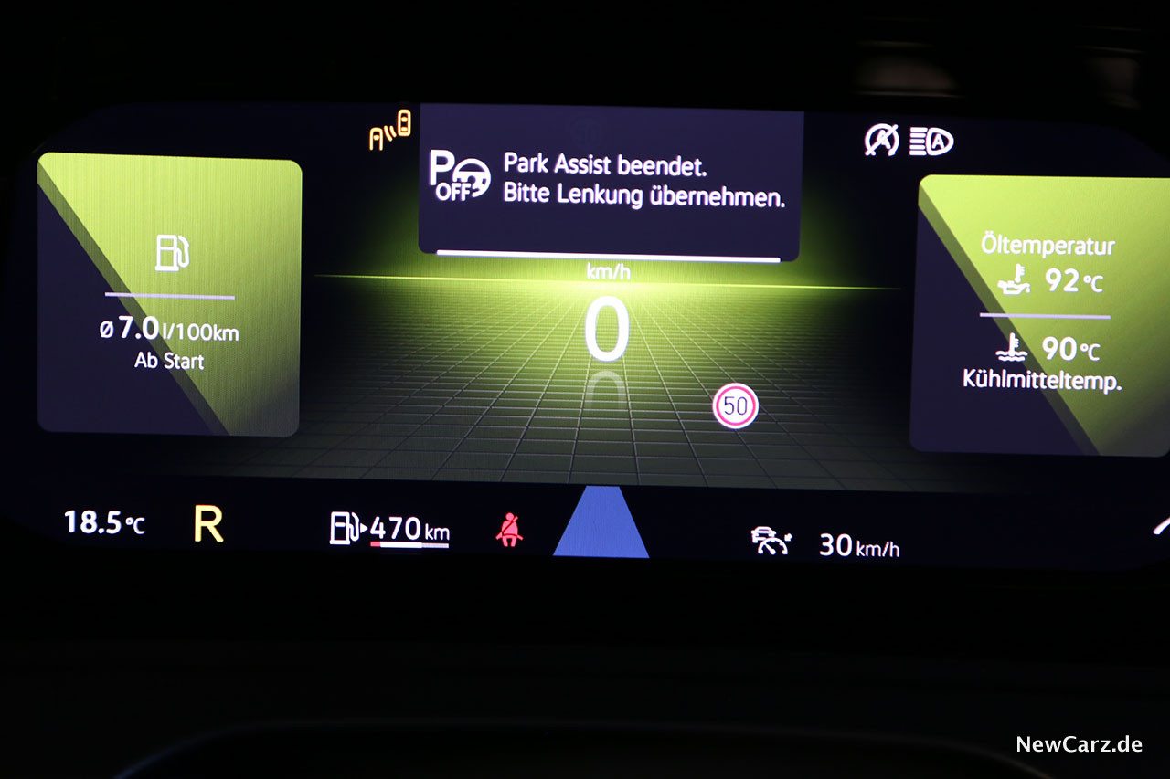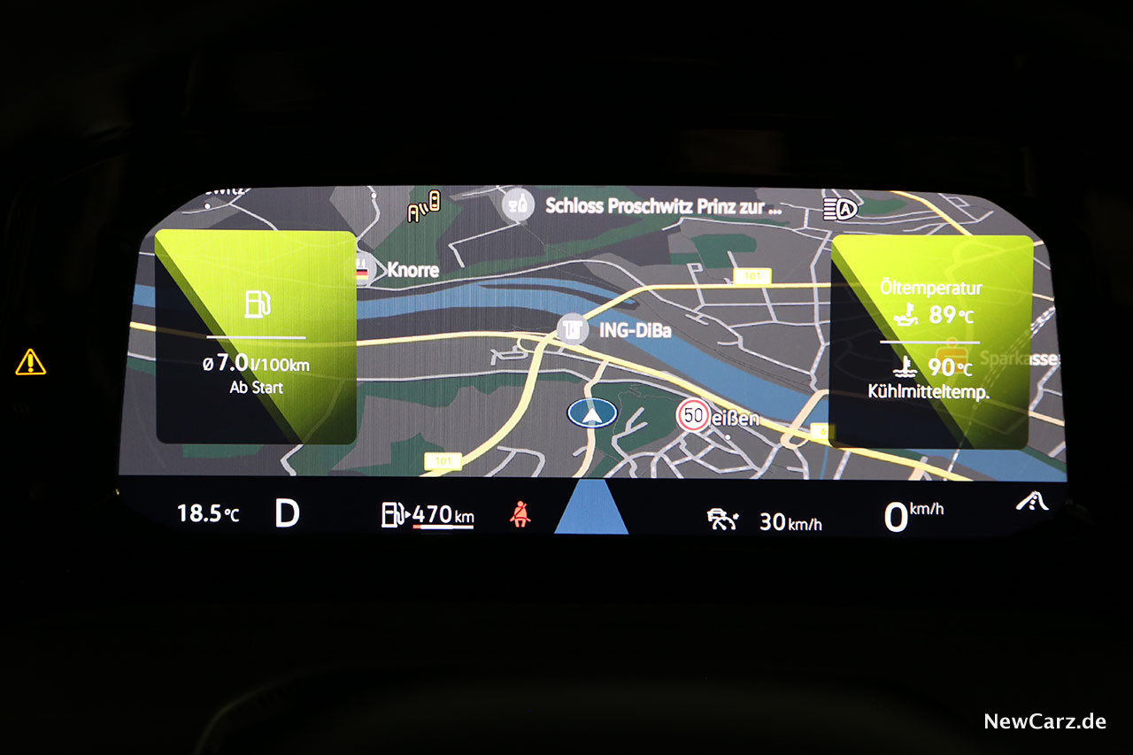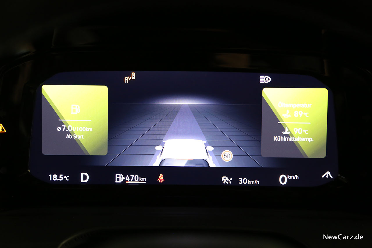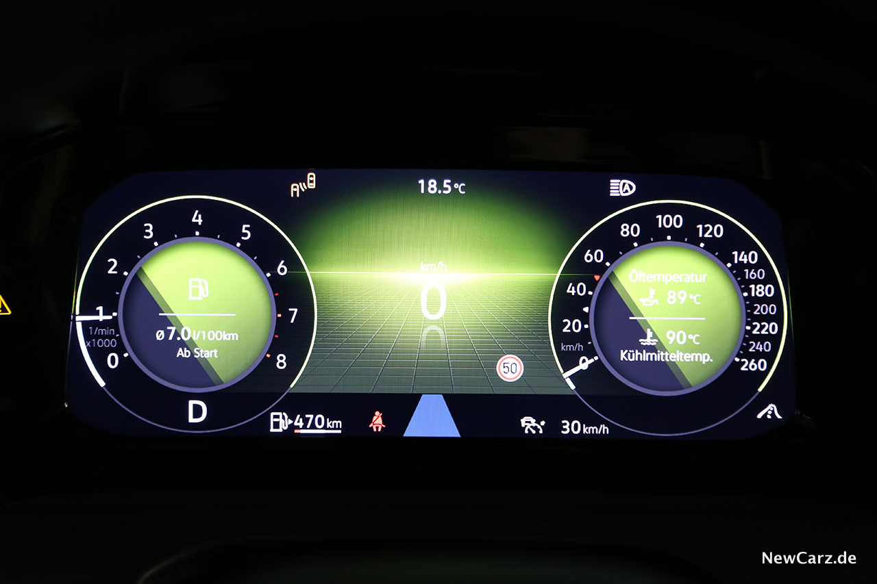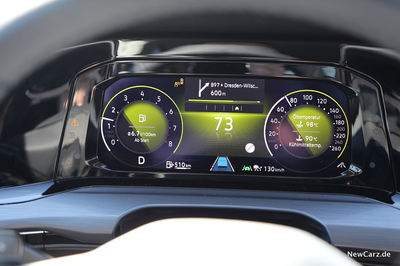Die Zylinderabschaltung im Teillastbereich erfolgt unbemerkt, wird lediglich durch ein kleines „Eco“-Symbol im volldigitalen Cockpit verraten. Auffällig ist dafür die Segelfunktion, welche sehr oft aktiv ist und den VW mit abgeschaltetem Motor auch bei Landstraßentempi ausrollen lässt. Das spart Kraftstoff und vermindert den Verschleiß.