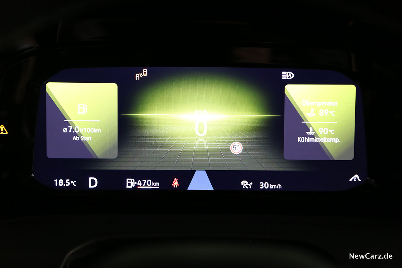 Das neue digitale Cockpit bietet eine hochaufgelöste, messerscharfe Darstellung und lässt sich in diversen Einstellungen konfigurieren. Dort kann man auch die Abstandsgegebenheiten anzeigen lassen, wobei neben den erkannten Fahrzeugen auch dessen Bremslichter leuchten, sofern ein Bremsvorgang detektiert wurde. Auch die Art der Fahrbahnbegrenzung wird erkannt und entsprechend im System angezeigt.