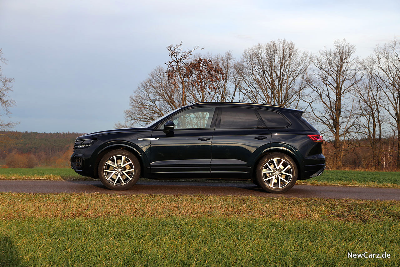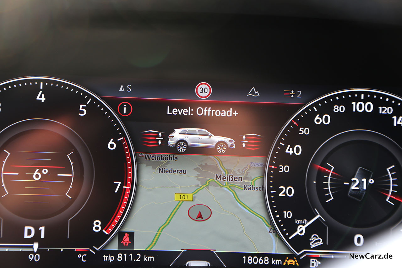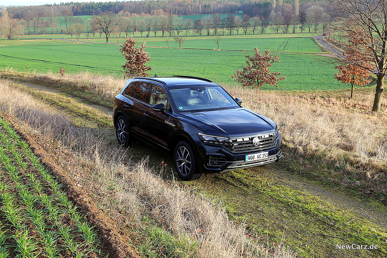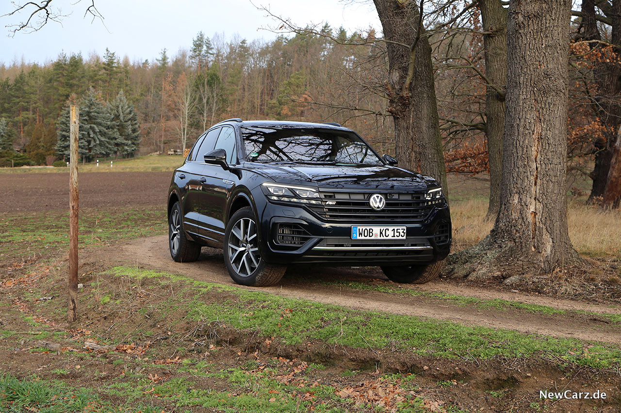 Vor allem die Wankstabilisierung trägt hier eine entscheidende Wirkung bei, die den Touareg weder in flott durchfahrenen Kurven zur Seite neigen, noch beim schnellen und schrägen Überfahren von Längsrinnen aus der Contenance bringen lässt. Kurzum fühlt sich das SUV allein dadurch deutlich kompakter an, als es die Abmessungen und das Gewicht vermuten lassen.