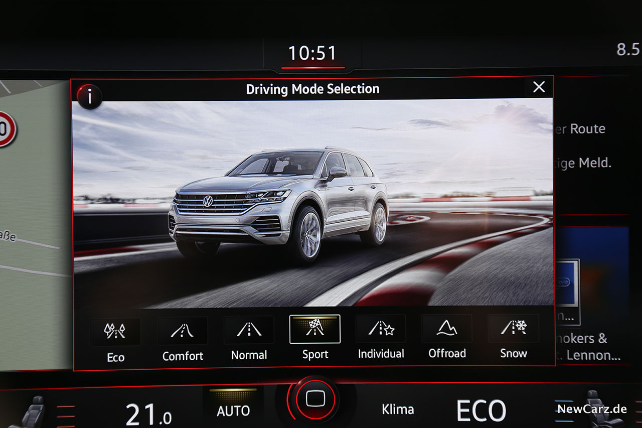 Die 8-Gang-Automatik verwaltet die Fahrstufen sehr komfortorientiert, wodurch eine sehr angenehme Fahrcharakteristik entsteht. Diese bleibt auch im wählbaren Sportmodus erhalten und verhindert dadurch besonders zackige Gangwechsel, wie man sie aus anderen SUV-Modellen kennt, welche die Sportlichkeit noch mehr im Fokus haben. Hier steht die Ausgewogenheit im Vordergrund und dies ist aus unserer Sicht den Wolfsburgern absolut gelungen.