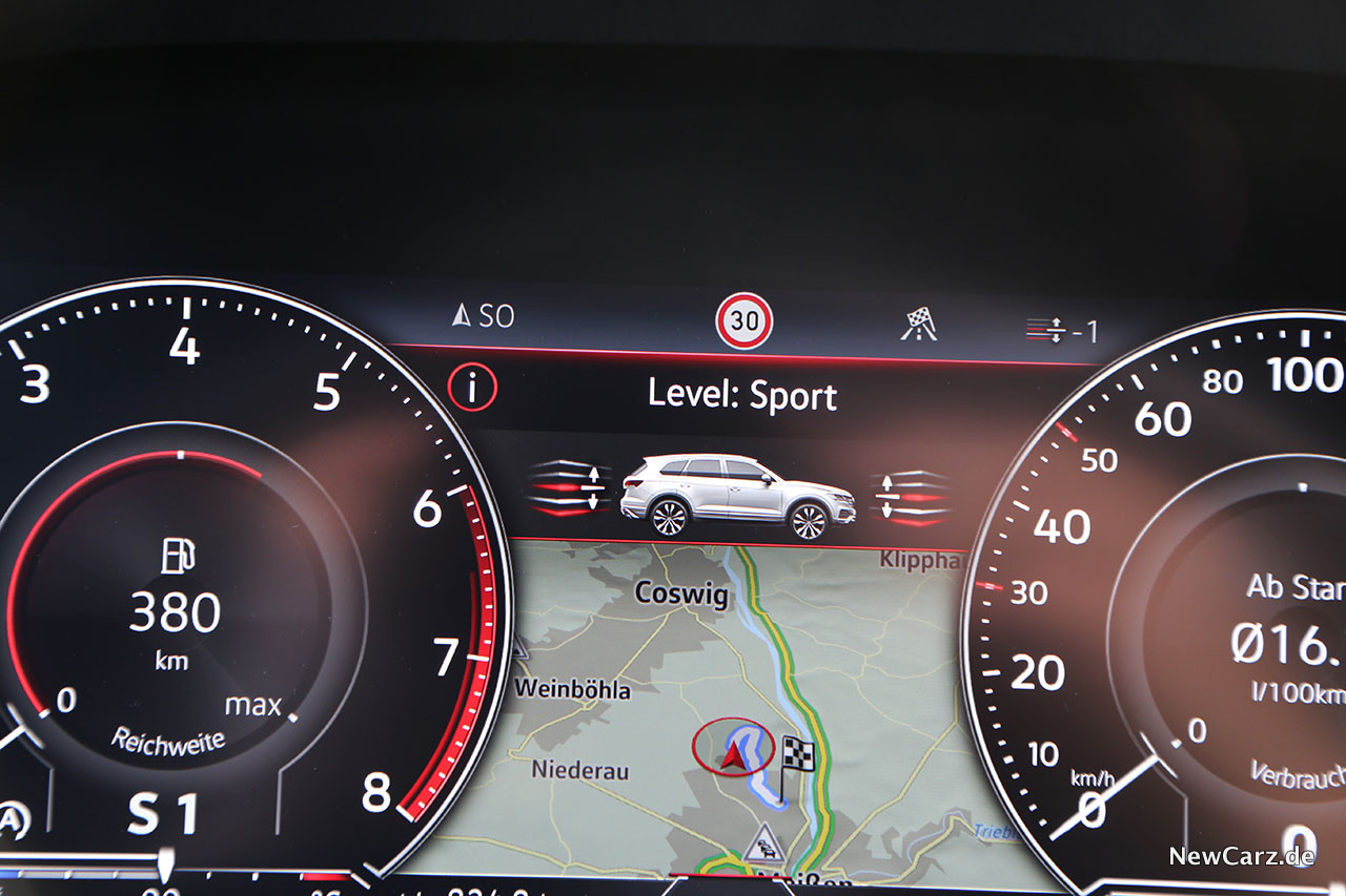 Der Komfortlevel in diesem Touareg ist sehr hoch und dies war vor allem der hier verbauten Luftfederung zu verdanken. Dieses Adaptivfahrwerk mit aktiver Wankstabilisierung – es kostet übrigens 5.900 Euro extra – macht das große SUV fahrtechnisch fast so handlich, wie eine Mittelklasselimousine.
